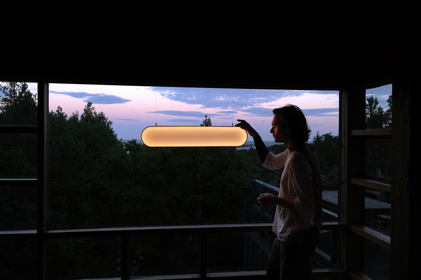 Sunne tiene la forma de una larga tira curvada de aluminio. En el lateral, contiene células solares que recogen energía durante el día y la almacenan en una batería integrada. Para encender o apagar el dispositivo, basta con tocarlo en la parte superior o utilizar la aplicación