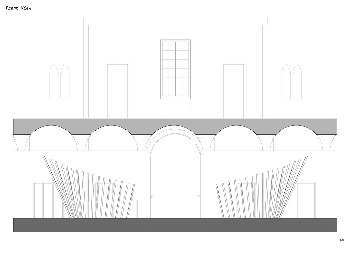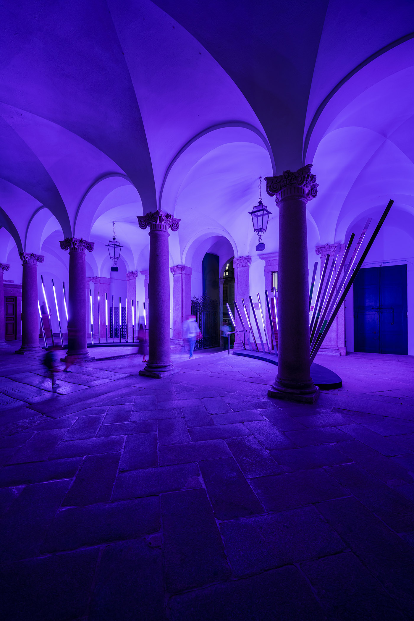 Con la intención de estimular el contacto humano, "porque la arquitectura siempre tiene que ver con las personas",noa* diseña el Transsensorial Gateway, una obra escultural que combina varios elementos, como la luz, el sonido y el movimiento, en un diálogo directo con las personas y el espacio. A ambos lados de la puerta hay una corona de estelas luminosas que, jugando a diferentes alturas, amplían visualmente la secuencia del pórtico del siglo XVII que hace las veces de escenario de la instalación