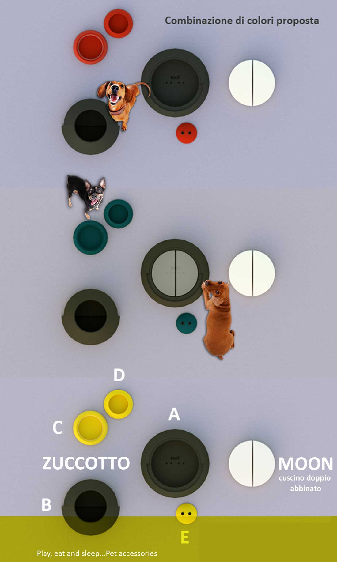 Francesca Di Giannantonio Designer, autora de otros proyectos de arquitectura, en su actividad como diseñadora no olvida ponerse en el lugar de quienes disfrutarán de su proyecto Zuccotto: los perros y sus dueños. El leitmotiv de la colección, de hecho, es precisamente la mirada: los ojos del perro y los de las personas, en un juego de colores y formas que hace que toda la línea sea vibrante y juguetona, explorando la relación dual entre perro y persona.