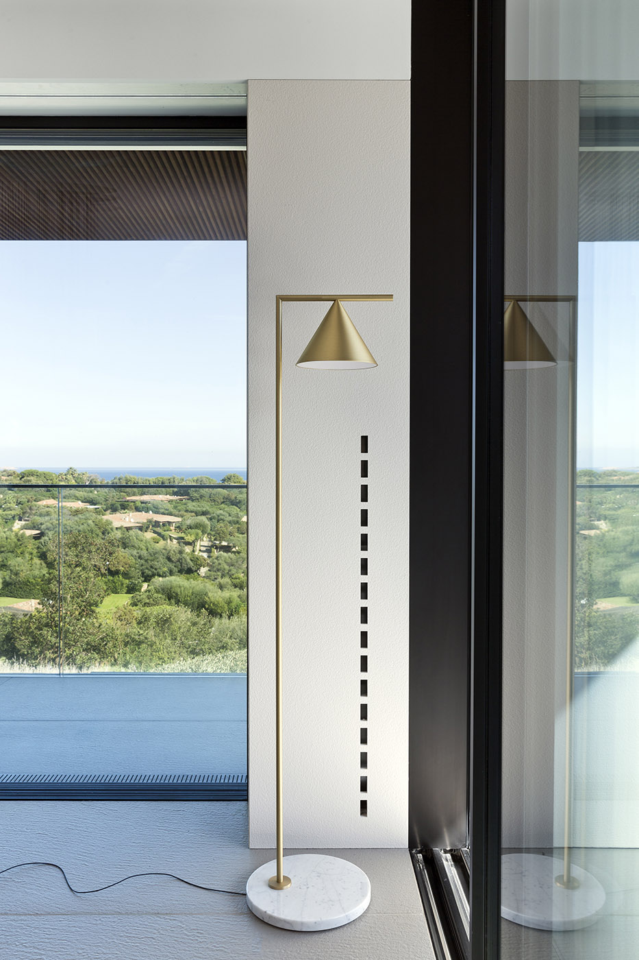 La facciata della villa è poi attraversata da un timpano che funge da elemento di discontinuità che taglia e divide il tetto a falda dal resto della struttura: la sua estensione, che eccede il perimetro delle pareti verticali, trasforma questo elemento architettonico in un pergolato di grande eleganza