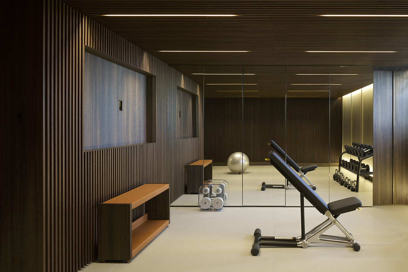 L’arredo è stato interamente disegnato su misura, unici prodotti di serie utilizzati sono di storiche aziende, grande importanza è stata data anche al sistema di illuminazione architettonica e decorativa: nel soffitto sono state realizzate velette luminose con luce indiretta.