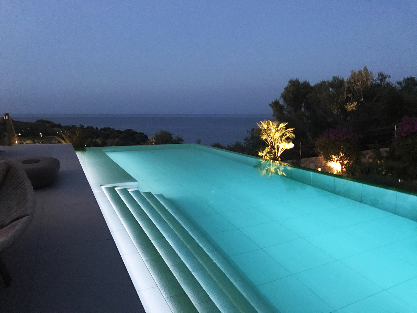 La sua inalterabilità agli agenti atmosferici e alla salsedine ne hanno consentito l’uso senza limitazioni tra interno ed esterno. La lavorabilità tipica delle pietre ha permesso la realizzazione di dettagli come i tori sul bordo piscina, la creazione di gradini retroilluminati da led sulla scala interna