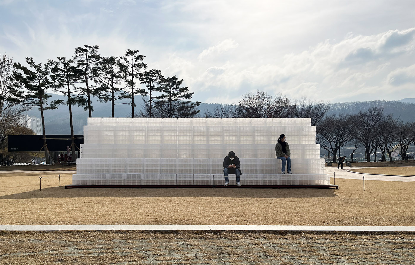 El proyecto de Hyunje Joo pretende presentar una nueva perspectiva de la vida cotidiana. 1300 Recycling Pavilion, situado en Daegu (Corea del Sur), utiliza miles de cubos de basura estándar, fácilmente disponibles, que se volverán a utilizar una vez que se desmonte el pabellón