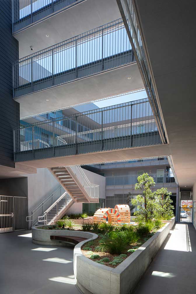 Uno de los proyectos de arquitectura diseñados por el estudio Brooks + Scarpa es el proyecto 1819 Pico, caracterizado por una arquitectura que se aleja del diseño de los edificios residenciales del barrio en el que se encuentra, los cuales están compuestos por muros sólidos y cercas, optando en cambio por un diseño más abierto y acogedor. Los espacios sociales, a los que se les da mayor importancia que a los espacios privados, crean un sentido de comunidad y conexión entre los residentes.