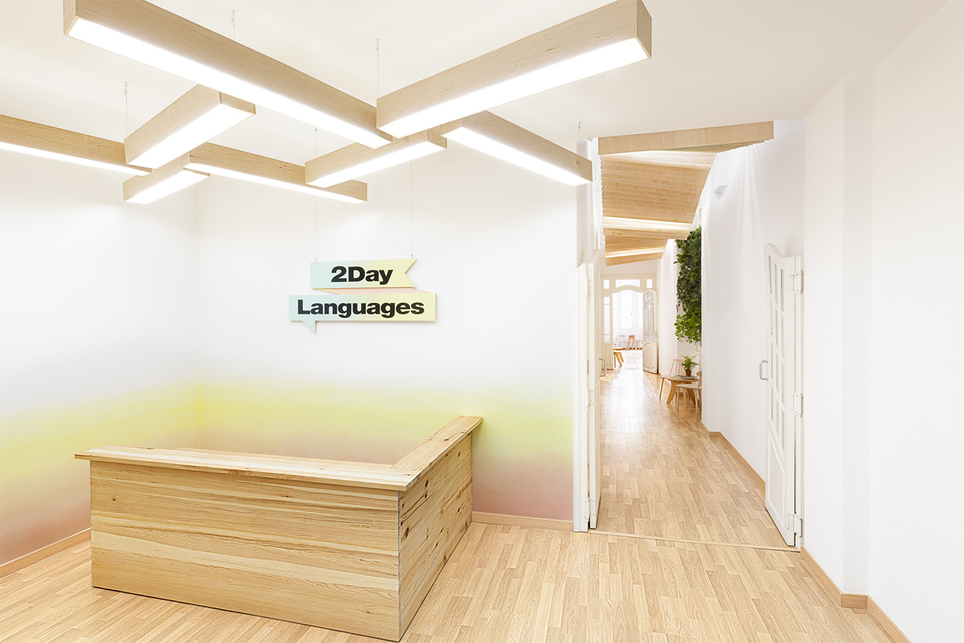 El espacio se subdivide en tres aulas, una sala de profesores y un salón. Cada una de las aulas y de las habitaciones es una desfragmentación de la identidad de la marca 2Day Languages e incluye partes del idioma español y la arquitectura valenciana, además de los tres colores de la propia marca, que a su vez son la representación de los tres niveles A, B y C establecidos por el marco común europeo de referencia para las lenguas. Por esta razón, cada clase tiene un color diferente que se extiende como si mostrara avance en el aprendizaje del idioma