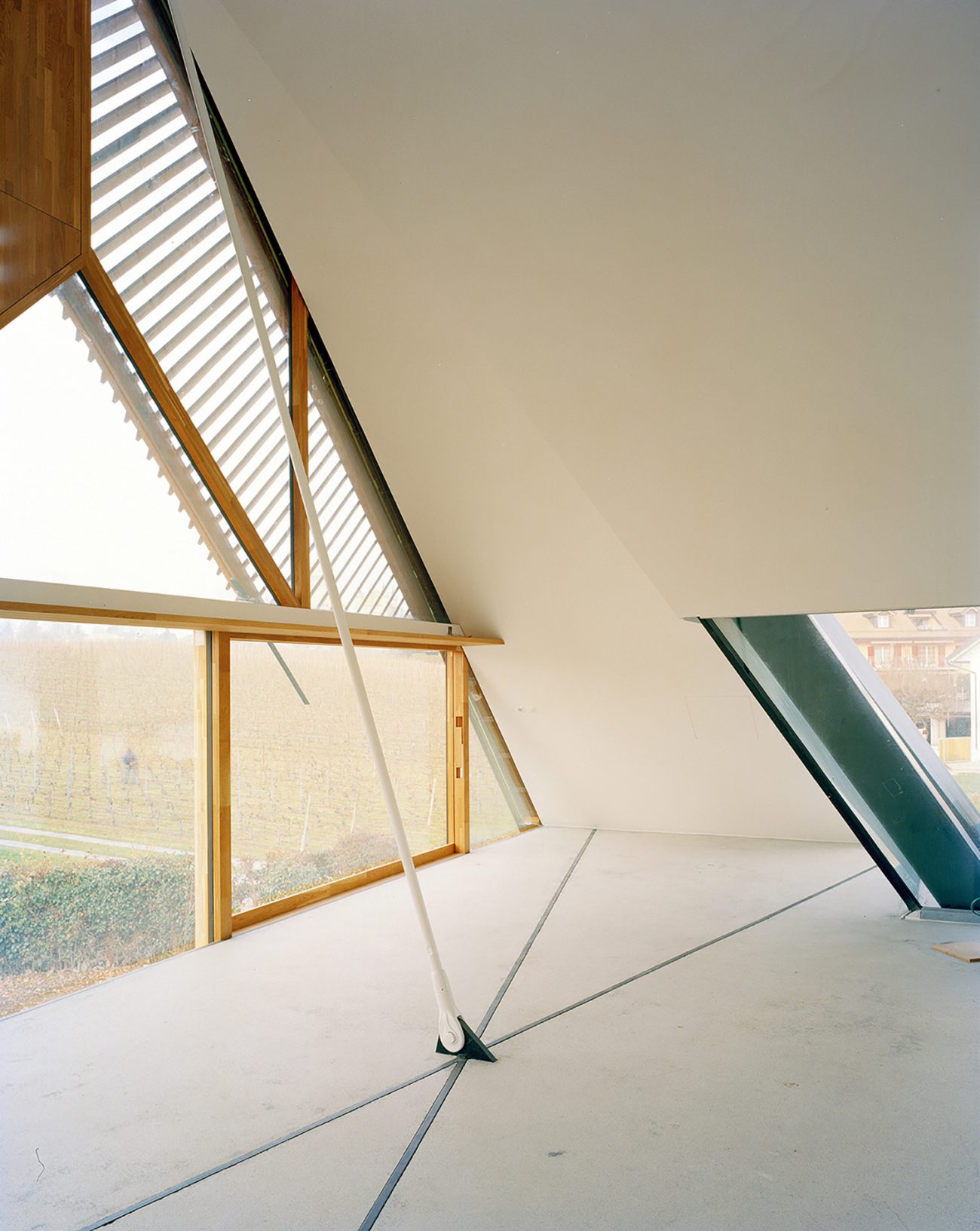 Desde el interior, los dos edificios se mueven hacia el paisaje, abriendo la vista sobre los viñedos y el huerto circundante. Con el tiempo, estarán completamente sombreados por árboles, plantas y flores que crecen entre los techos y reflejan la floreciente fusión entre el desarrollo de viviendas y la naturaleza