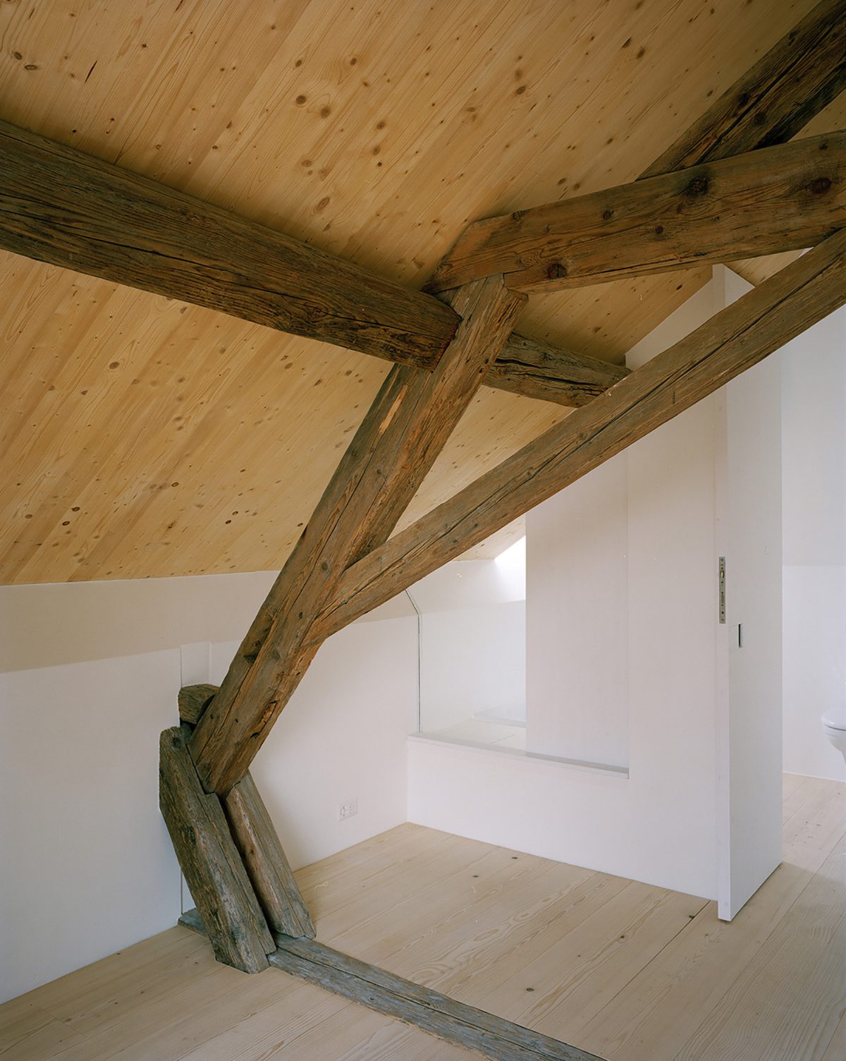 El exoesqueleto del Grange encarna una reverberación de la armadura del techo expuesto del Pressoir. Como consecuencia, el orden lógico se invierte y el acero primario expuesto se completa con una estructura de madera secundaria. El arquitecto Dieter Dietz se da cuenta de que estas casas ofrecen un marco para vivir. Como un lienzo dibujado en el espacio que espera que la vida se complete. Los usuarios definirán aún más la articulación visual y espacial