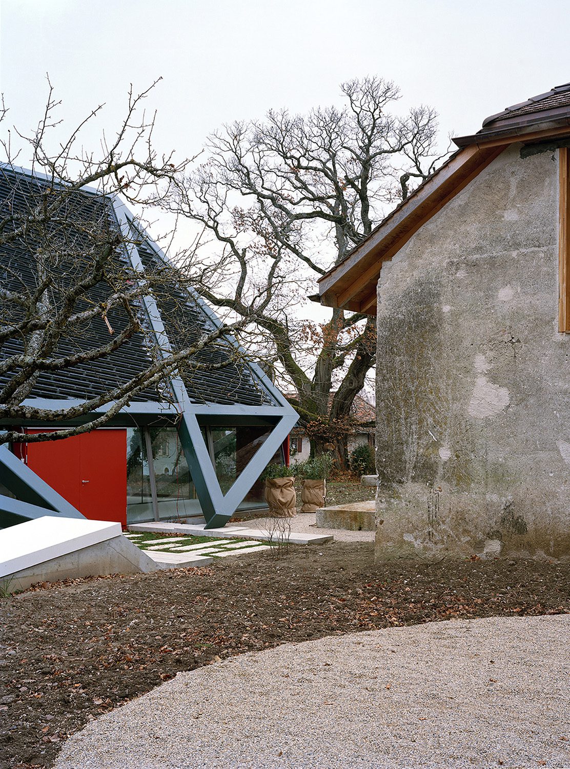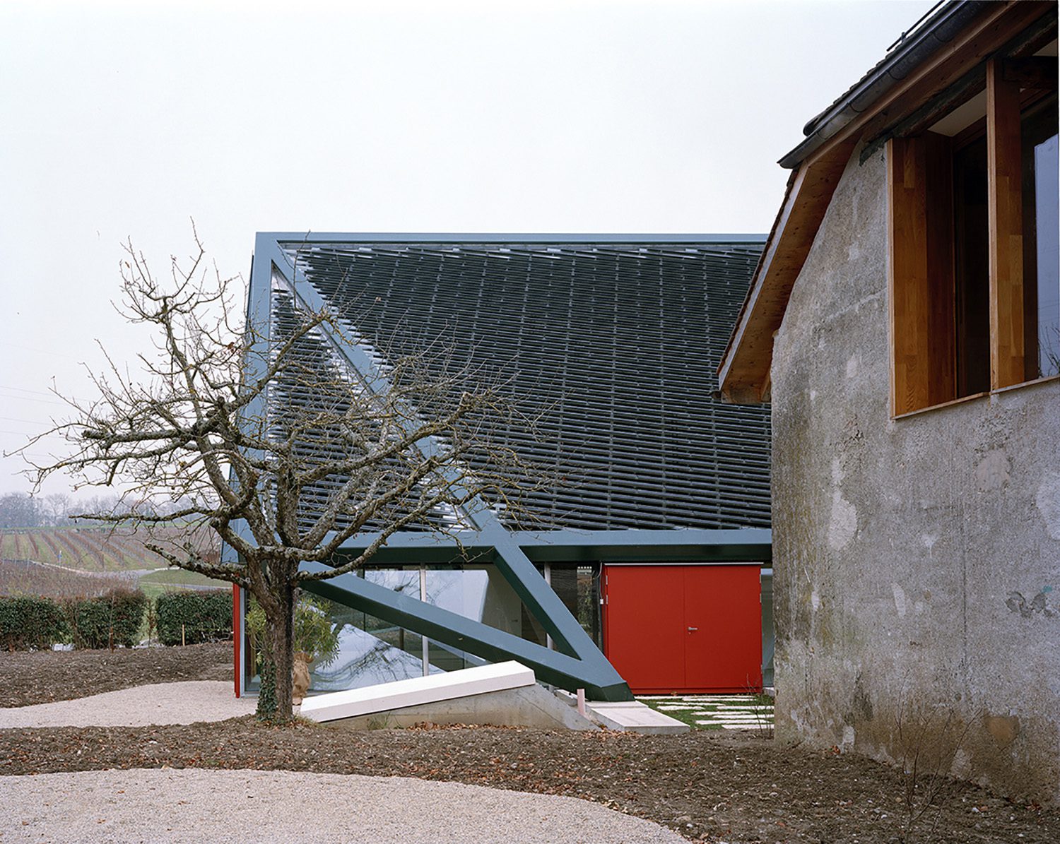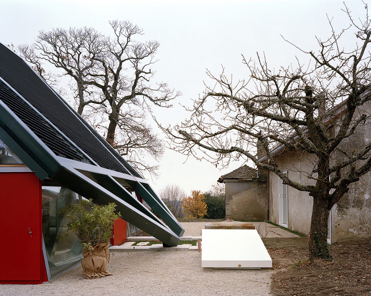 Realizando una casa y siguiendo la tipología del granero, se agregó una masa gravitacional adicional a la interacción de los volúmenes entre los árboles. El jardín sigue siendo el lugar de identidad, donde el renovado Pressoir (oficina de prensa) y el nuevo Grange (granero) articulan un patio intersticial en el paisaje ininterrumpido. Las castañas caerán cerca de un nuevo techo, construido completamente con células solares recubiertas de nanofilm que proporcionan energía para las casas nuevas y las reestructuradas