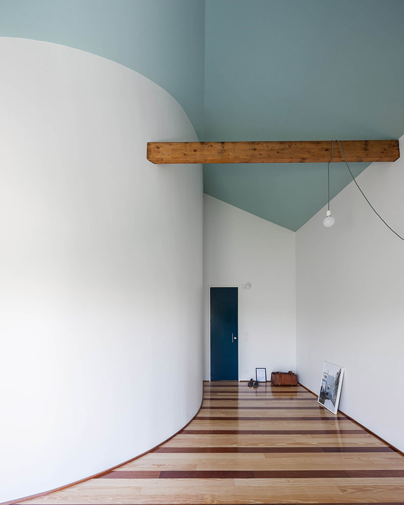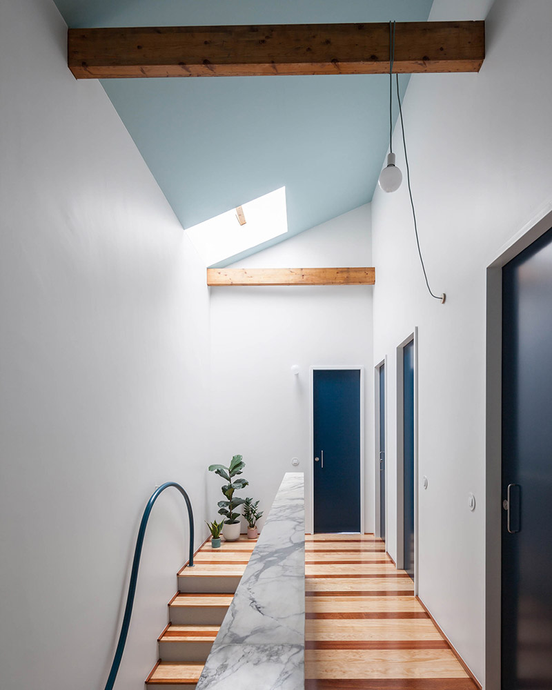El primer piso, en cambio, es una composición de habitaciones intrincadas, con diferentes geometrías y espacios irregulares, que se adaptan al estrecho perímetro del sitio. Paredes blancas y fluidas se entrelazan con pisos de madera rayados y techos azules, con toques de mármol, rosa y azul de vez en cuando
