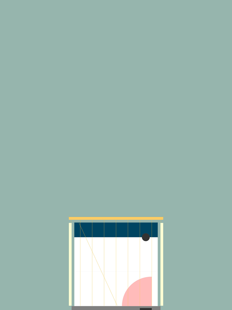 En el interior, gracias a la presencia de cinco tumbonas, es posible sentir cierta familiaridad en esta construcción, que de lo contrario terminaría siendo demasiado monumental. La combinación y la contradicción son características predominantes dentro del proyecto, cada elemento se integra y se contradice al mismo tiempo que el otro