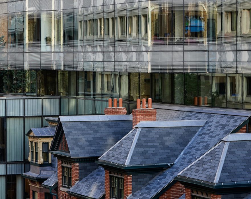 Las fachadas del patrimonio de las seis casas adosadas construidas en 1880 han sido restauradas meticulosamente por ERA Architects, restaurando el encanto original de los muros, ventanas, revestimientos, buhardillas y techos inclinados. Las entradas a los espacios comerciales orientados a la calle se han modificado para una accesibilidad inclusiva, preservando el carácter histórico de los edificios. Dentro de las casas urbanas reconstruidas se han mantenido como suites de oficina individuales, para preservar la calidad del espacio dentro de las casas antiguas y dividir los niveles inferiores en pequeñas suites comerciales de varios niveles creando una experiencia sutil a nivel de carretera