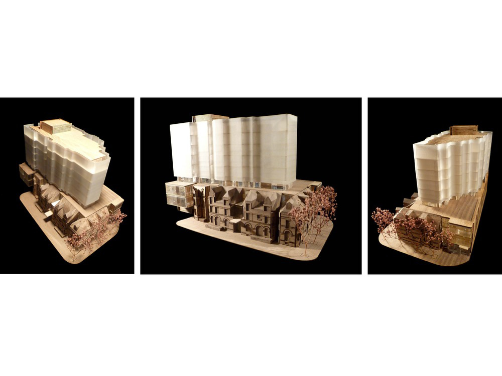 Seis casas históricas están integradas en un podio de tres pisos, con una sinuosa torre de seis pisos arriba. El desarrollo alberga tiendas minoristas a nivel del suelo y espacios de oficinas en condominios, combinando un alto diseño, responsabilidad ecológica y mejora cívica. "Vemos este proyecto como un representante de la calidad que vemos a nivel mundial, en ciudades como Londres y Nueva York, pero construido localmente", dijo David Pontarini, socio fundador de Hariri Pontarini Architects. "Es un testimonio de la voluntad de Patrick Quigley, presidente de St. Thomas Commercial Development, de llevar a la ciudad a los límites del diseño en Toronto". El diseño nació del deseo de integrarse perfectamente en el tejido existente del vecindario y contribuir al entorno urbano