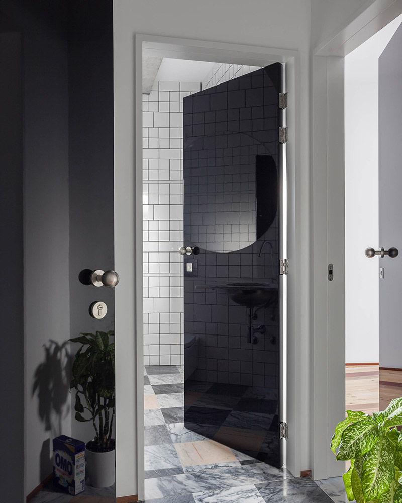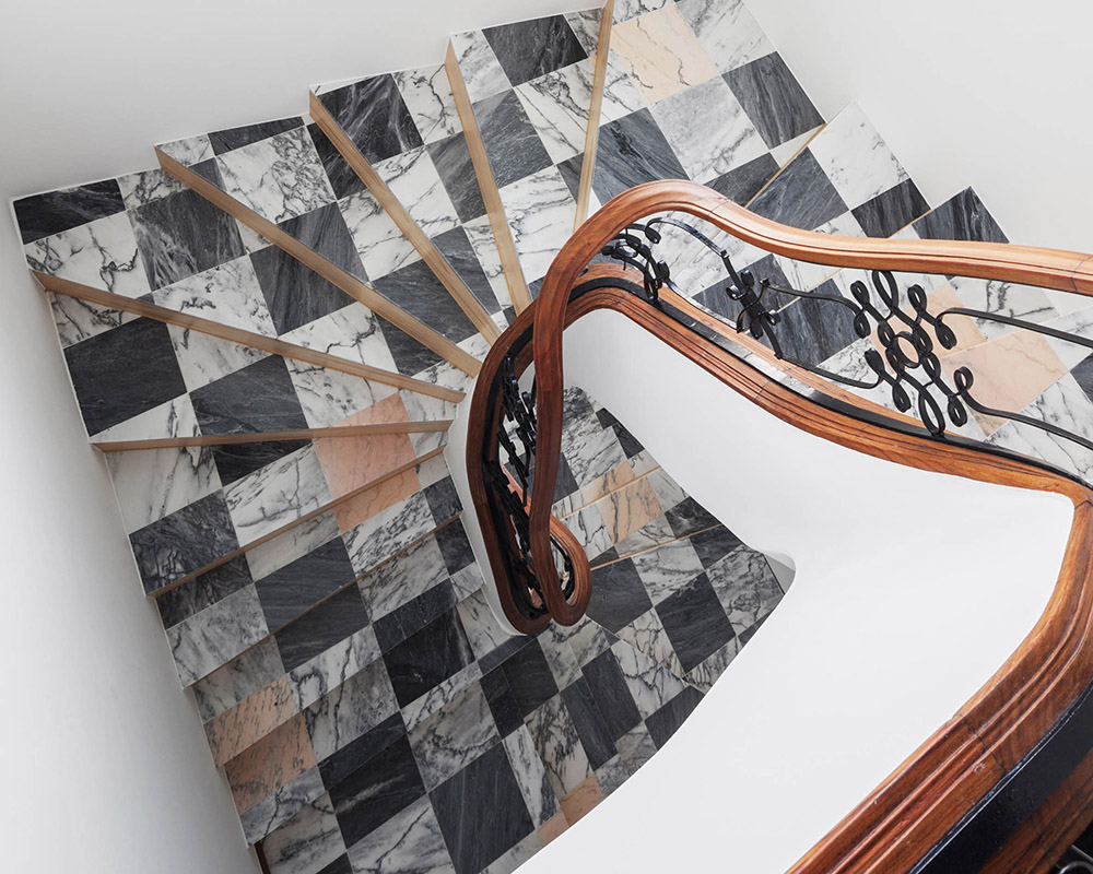 La escalera de caracol es el elemento unitario de la casa, equipada con un pasamanos romántico preexistente y un damero de suelo con diferentes tonos de mármol, generando un ambiente alegre