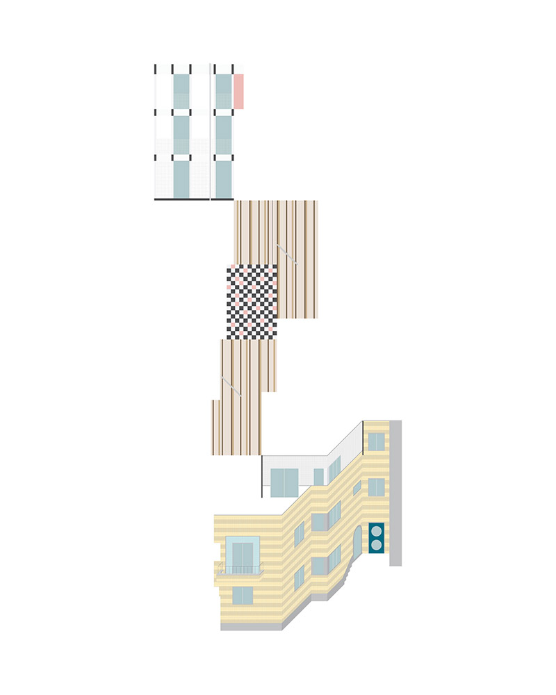 El lenguaje "de rayas" se repite en ambas fachadas, contrastando la heterogeneidad del proyecto. A pesar de las pequeñas inconsistencias arquitectónicas, el proyecto se las arregla para encontrar un nuevo tipo de armonía