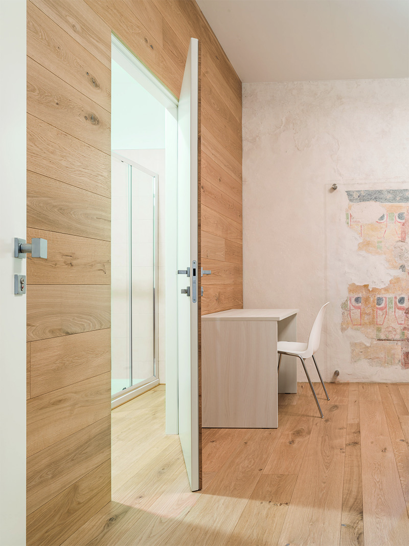 Un nodo progettuale importante è stato quello di inserire all’interno delle stanze i servizi igenici che in origine non erano parte delle celle dei monaci, la soluzione progettuale è stata quella di creare dei contenitori che si differenziassero dal contesto storico, quindi un rivestimento in legno su tutti i lati del vano ha permesso di identificare il nuovo manufatto e al contempo lo integra nel nuovo assetto compositivo della foresteria. L’assenza di finiture esterne e il rivestimento della porta con la boiserie in legno circostante ha permesso la completa integrazione dell’elemento con la parete, nascondendo l’accesso al bagno. Questa soluzione è stata resa possibile grazie all’installazione del telaio dedicato ECLISSE Syntesis Line battente.