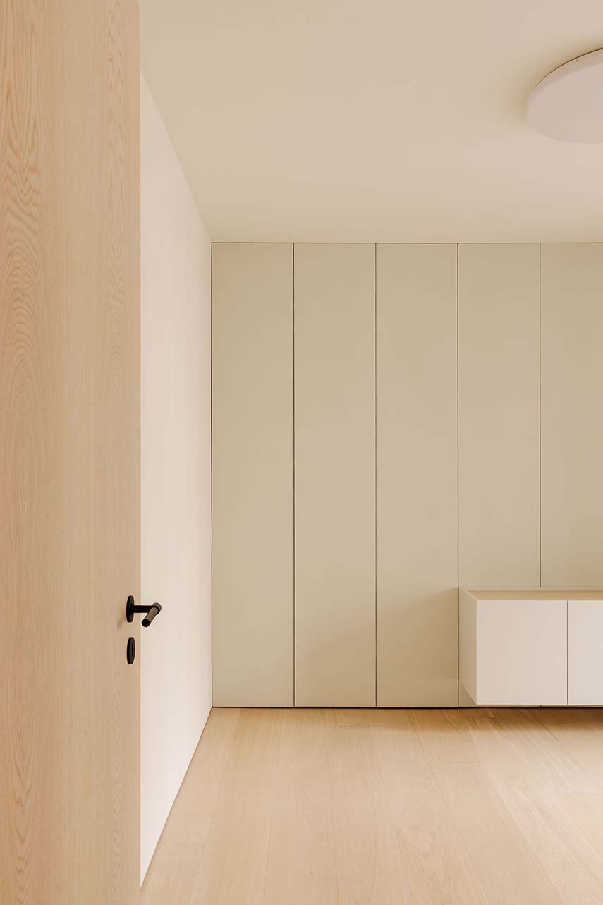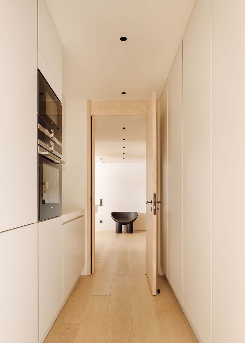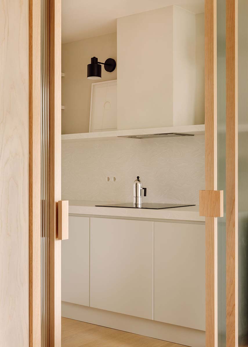 También se amplía la conexión entre la sala y la cocina mediante una puerta corredera translúcida. En la intervención se construye de nuevo el sistema de escaleras, lo que conlleva una reorganización de las alturas del techo; se instalan puertas de altura completa y se realizan nuevos acabados en los techos
