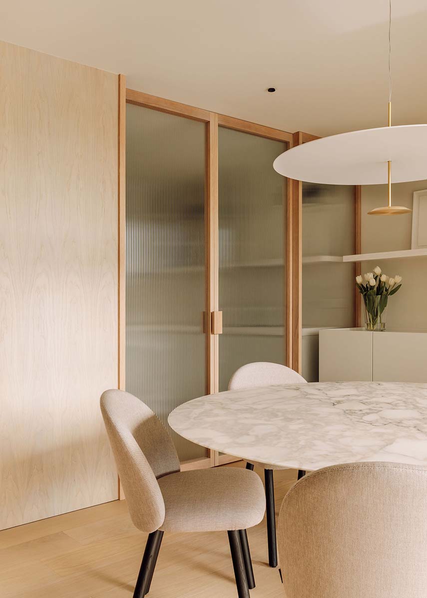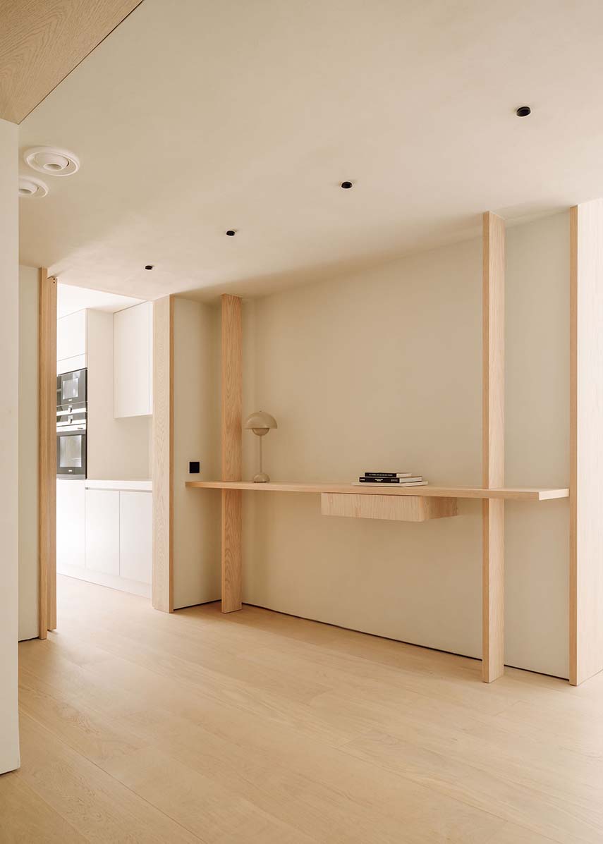 En la cocina y en los baños, la diversidad de materiales, texturas y temperaturas busca utilizar y destacar los diferentes estados de ánimo que acompañan al cambio de la iluminación natural. El diseño de la iluminación y de algunos elementos del mobiliario, junto con otras decisiones tomadas con los clientes para el estilo general del apartamento, refuerzan su tono íntimo y personalizado, así como la comodidad que ofrece a sus habitantes