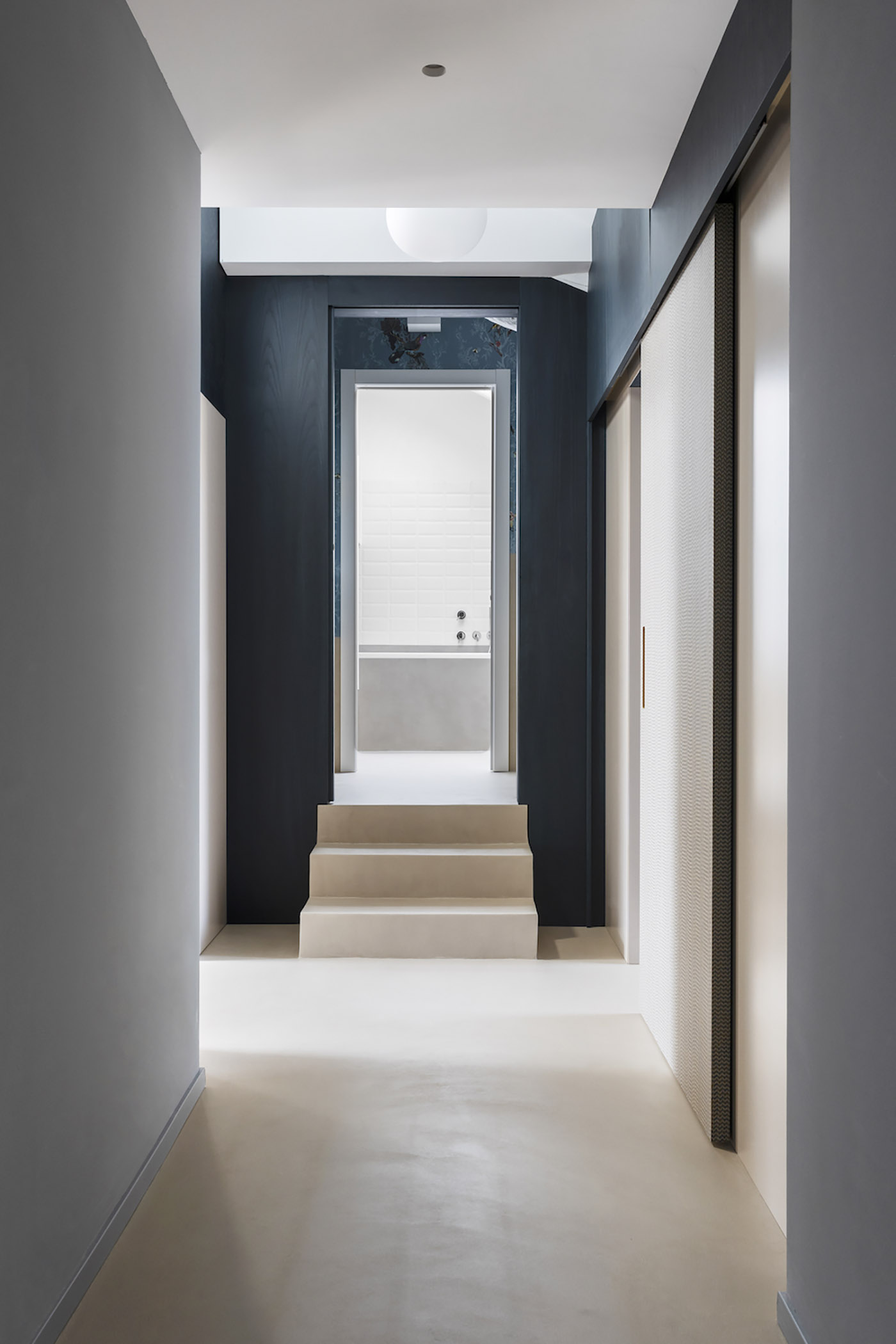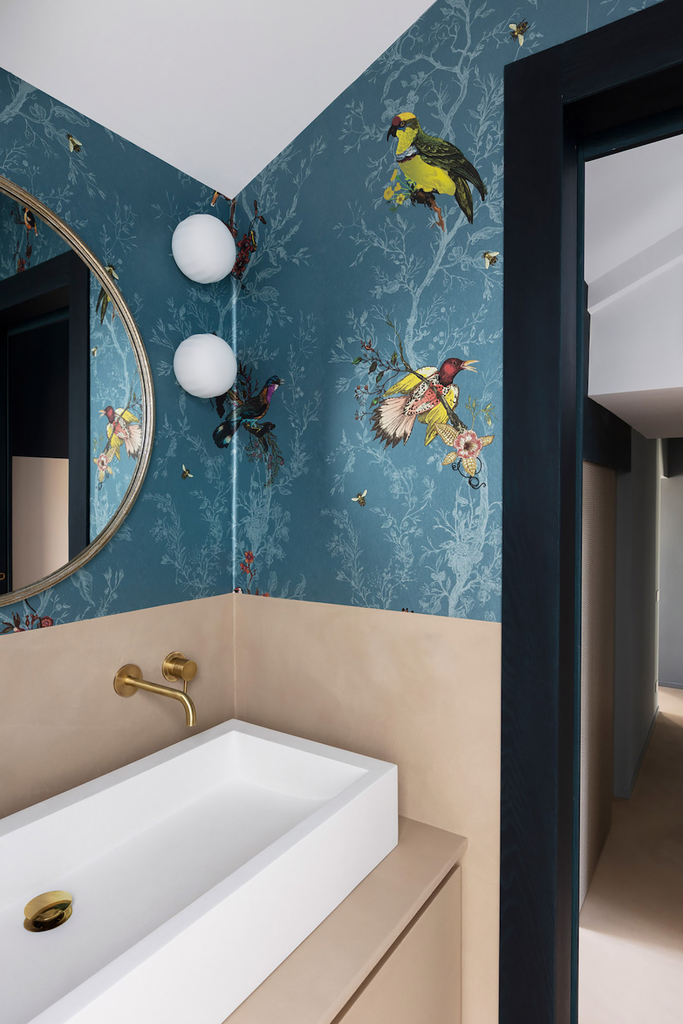 Desde el pasillo creado por divisiones formadas por muebles fijos útiles para crear preciosos volúmenes-contenedores, se accede al cuarto de baño principal y a los dos dormitorios: en el primero, el papel tapiz Birds N Bees de TimorousBeasties da una nota lúdica al espacio, acentuada por la presencia de las lámparas de pared esféricas de vidrio soplado Lita de Luceplan. El perímetro de ambos dormitorios está formado por armarios de madera lacada de altura completa, realizados según un diseño ad hoc que contempla hasta el más mínimo detalle, incluso el diseño del asa