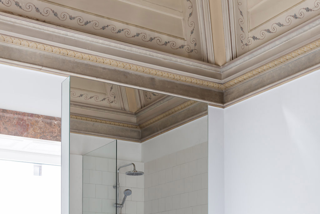 Precisamente por estos motivos, el suelo hace gala de grandeza y riqueza tanto en los materiales como en los detalles decorativos. Las intervenciones en el apartamento son limitadas y ocasionales, con el objetivo de hacer el espacio más habitable conservando la estructura espacial y los materiales de acabado originales