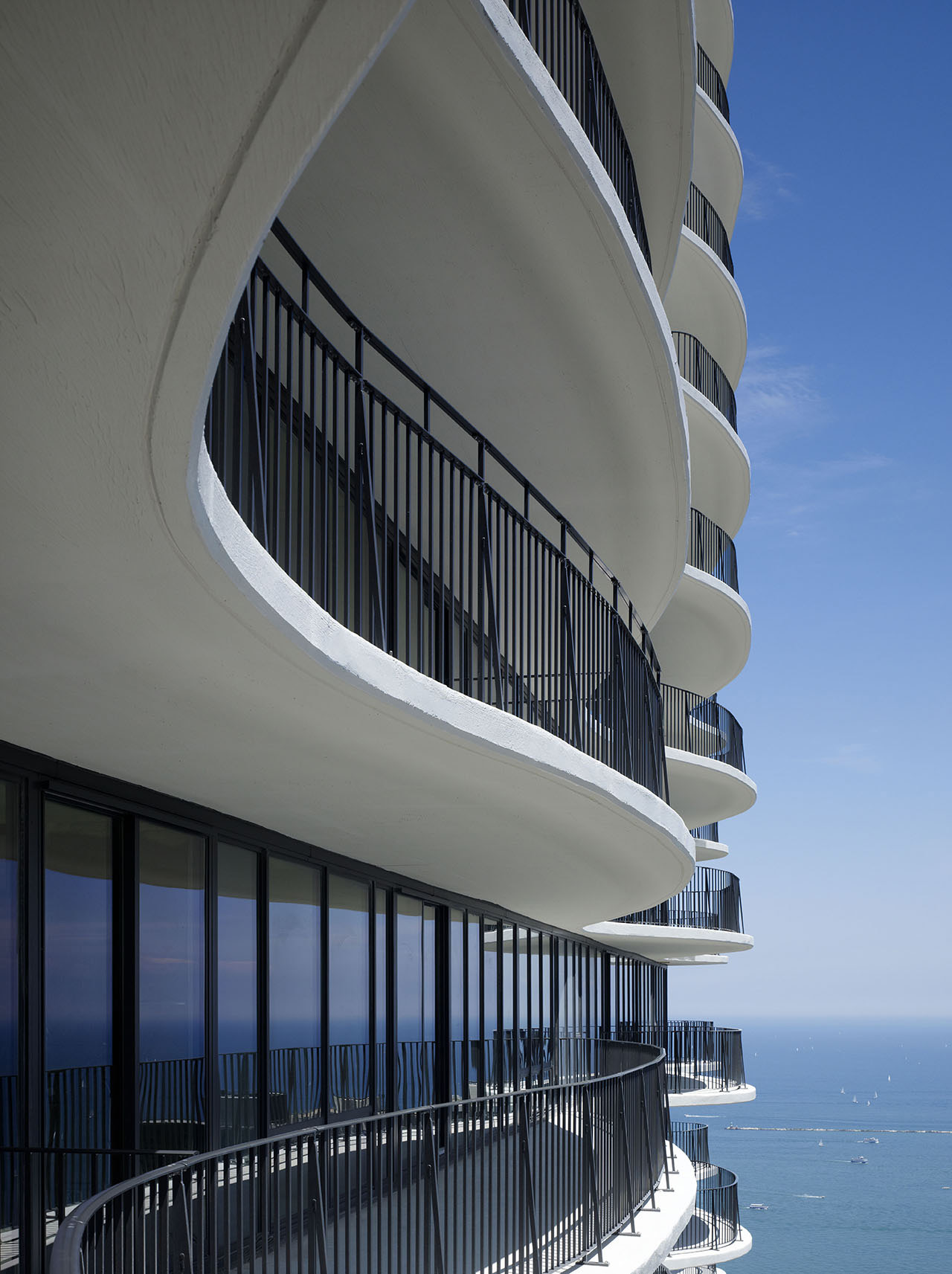 La Aqua Tower es un rascacielos de 82 pisos de uso mixto que incluye un hotel, apartamentos, condominios, estacionamientos y oficinas. A diferencia de los rascacielos normales, que tienen pequeños corredores de vistas entre edificios existentes, la Aqua Tower está diseñada por Studio Gang para capturar vistas particulares que de otra manera serían inalcanzables. Entre las características destacadas del edificio se encuentra la terraza en la azotea verde en la parte superior de su zócalo, que es una de las más grandes de Chicago y contiene una piscina al aire libre, pista de carrera, jardines y terraza de yoga.