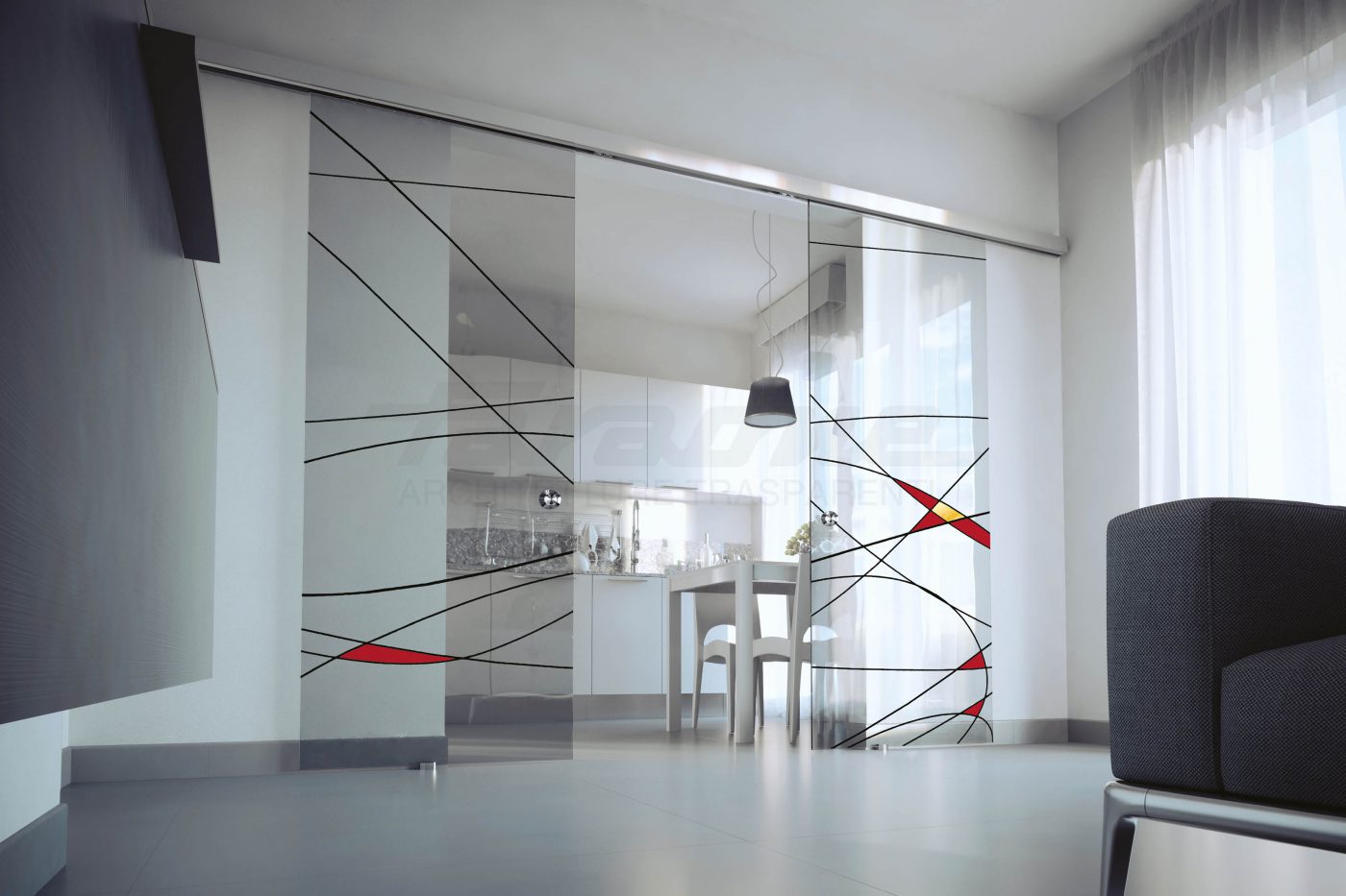 Il sistema di porte scorrevoli in vetro con cornice. Il sistema prevede anche la possibilità di inserire un divisorio in vetro senza cornice. Stesso binario di Velo e stesse soluzioni di ancoraggio a parete, a soffitto, incassato, tuttovetro. Il binario è in alluminio con misure standard, taglio su misura a richiesta. 10 mm vetro-muro e vetro-vetro. Nuovi accessori: cornici, guide e maniglie