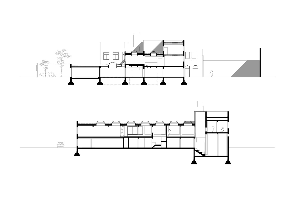 Por ejemplo, un pabellón tiene lugar en la entrada del sitio, conectando el edificio adyacente y la plaza. En el interior hay una cocina pública en la planta baja y un estudio de baile en la planta superior con vistas al barrio de Bruselas