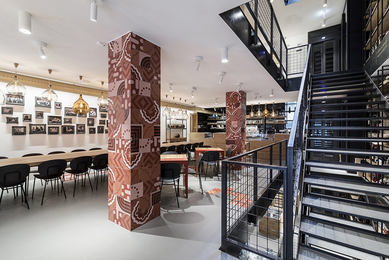 En la planta baja, los huéspedes son recibidos por un ambiente relajado caracterizado por una larga mesa para compartir y una pérgola externa donde se exhiben los productos que se pueden comprar y que recuerda la idea de la plaza y el mercado. Los pisos están divididos por función: en la planta baja, el bar-pizzería, en los pisos subterráneos el mercado y la gran bodega, en los pisos superiores los restaurantes