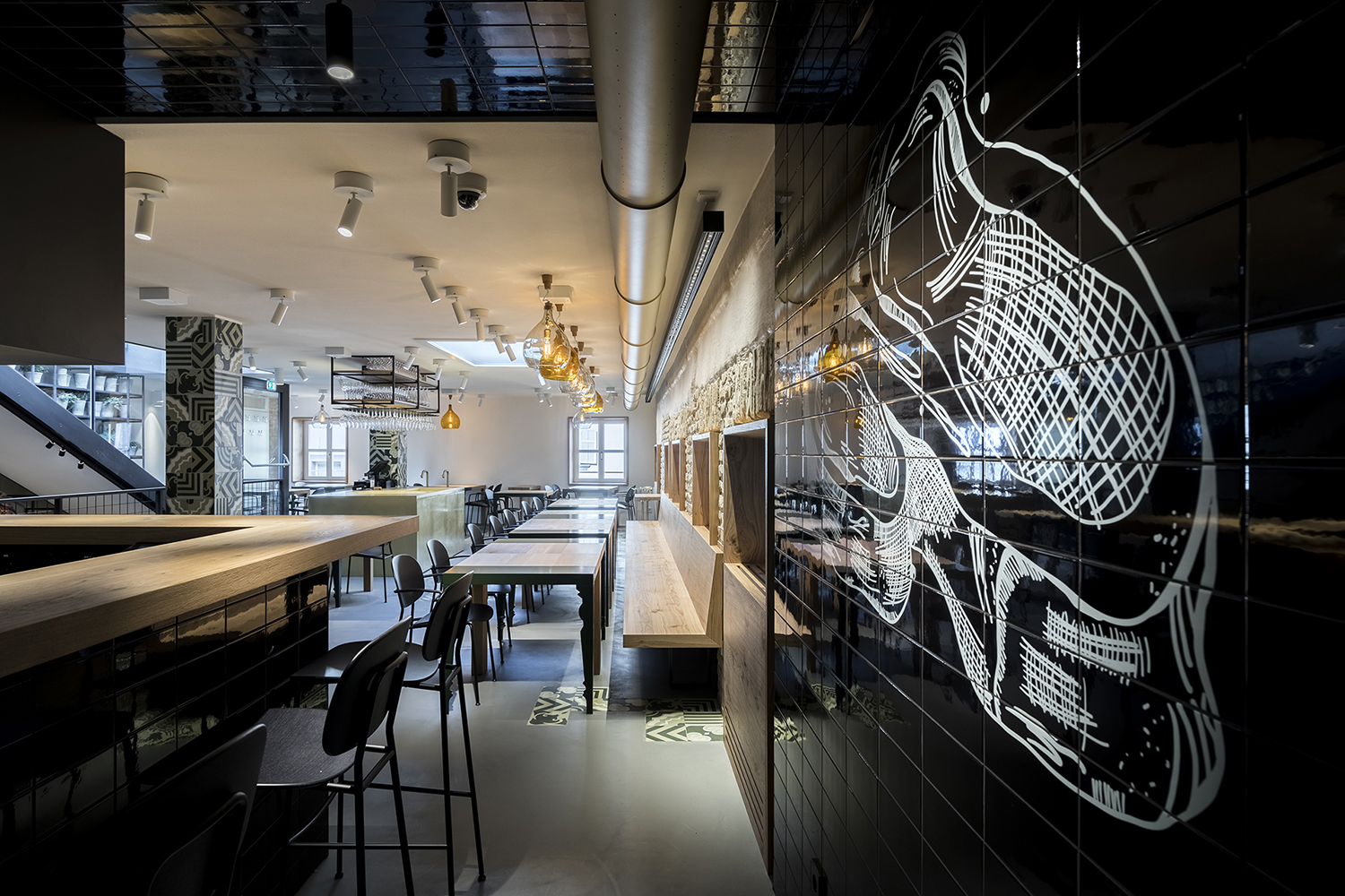 En términos de comunicación visual, todo el lugar está concebido y enfocado en el contraste entre las cocinas y los comedores. Los comedores se caracterizan por diferentes tonos de color para cada piso, recreando ambientes cálidos y animados, con iluminación suave y materiales naturales, mientras que en las cocinas son completamente monocromáticos y están diseñados para enfatizar visualmente el aspecto escenográfico de la preparación de alimentos, en estos ambientes sugerentes dominan los tonos de blanco o de negro, con superficies brillantes y reflectantes para enfatizar la profesionalidad del trabajo y dar una sensación de pureza, refinamiento e incluso una cierta sensualidad
