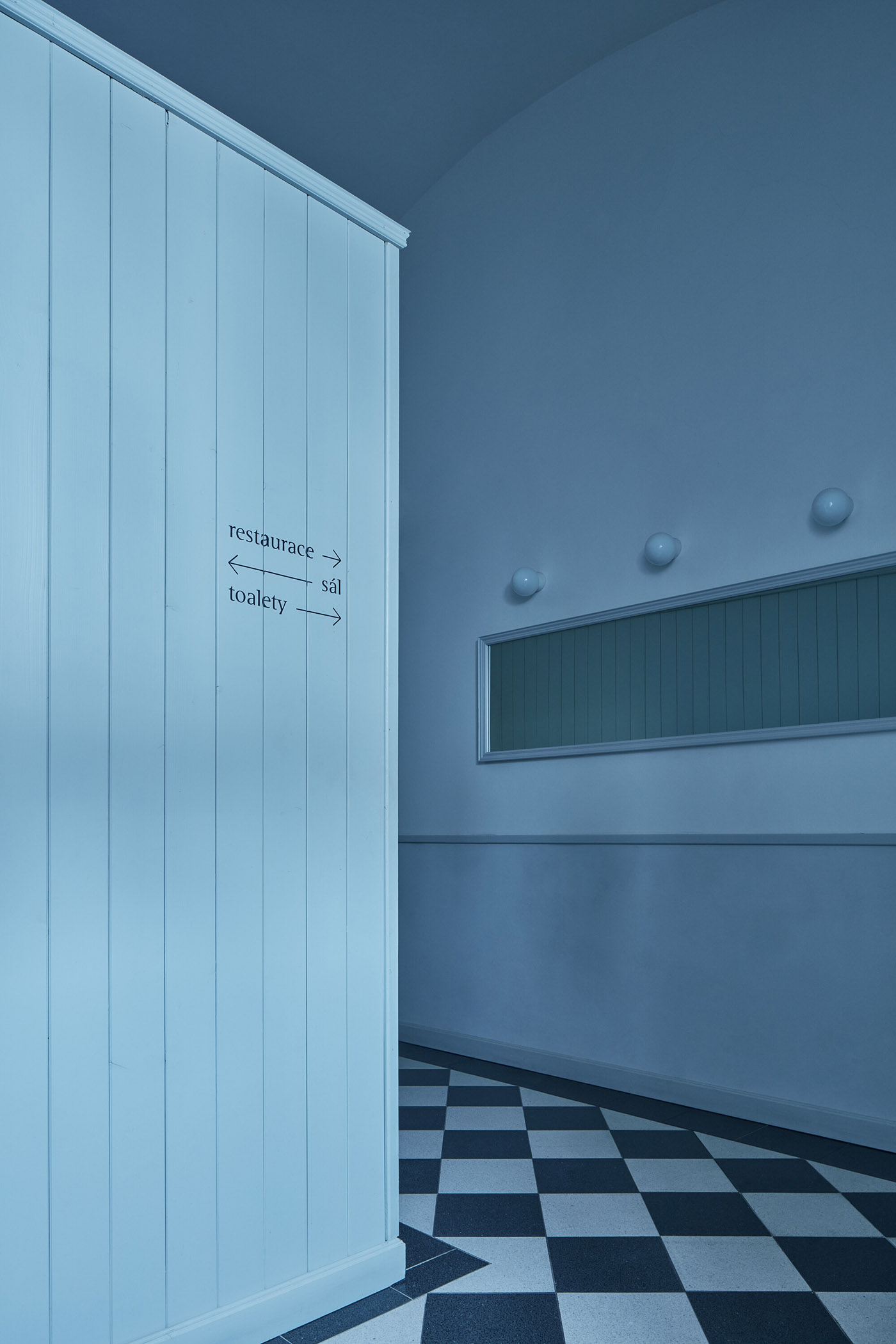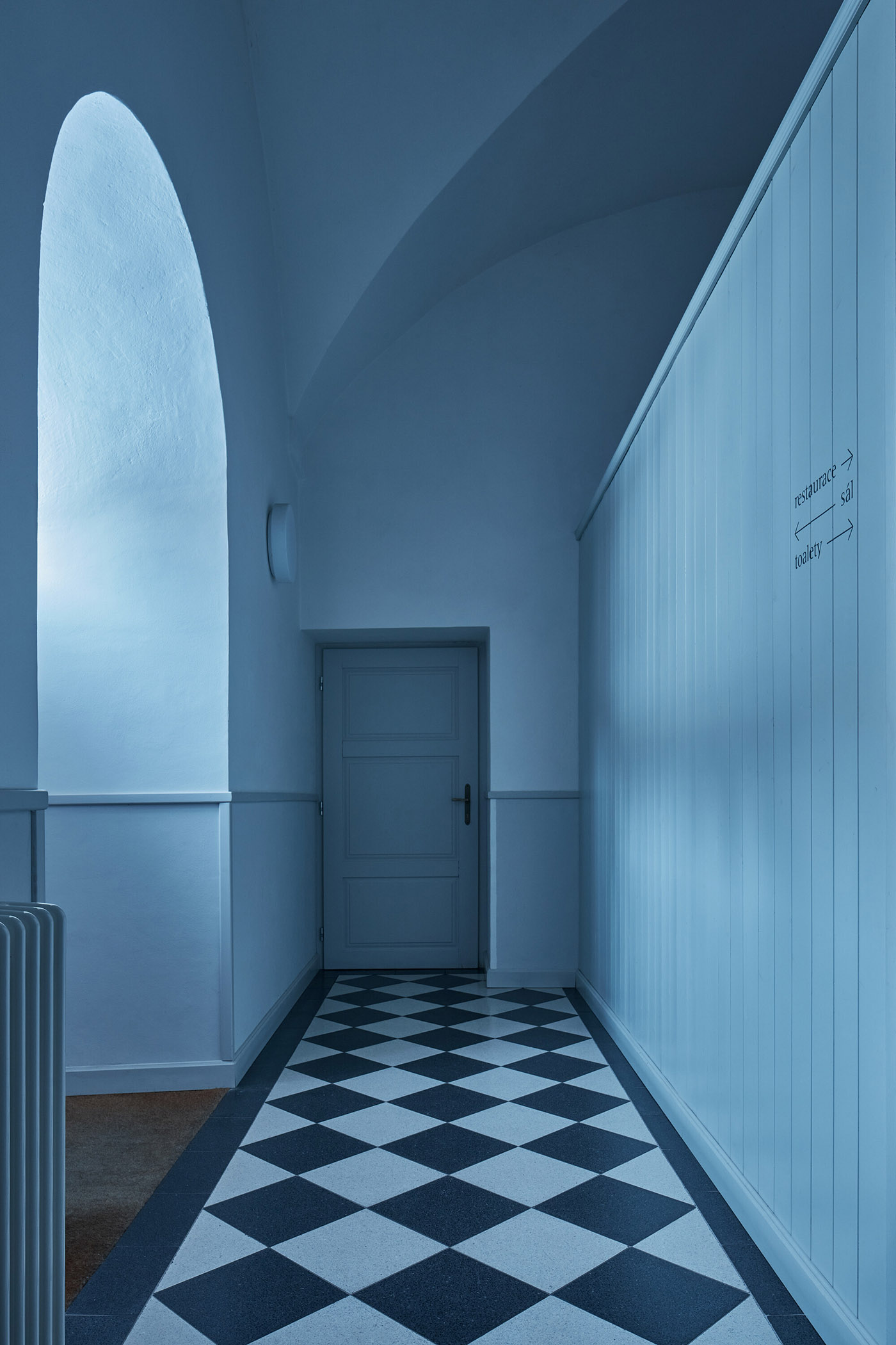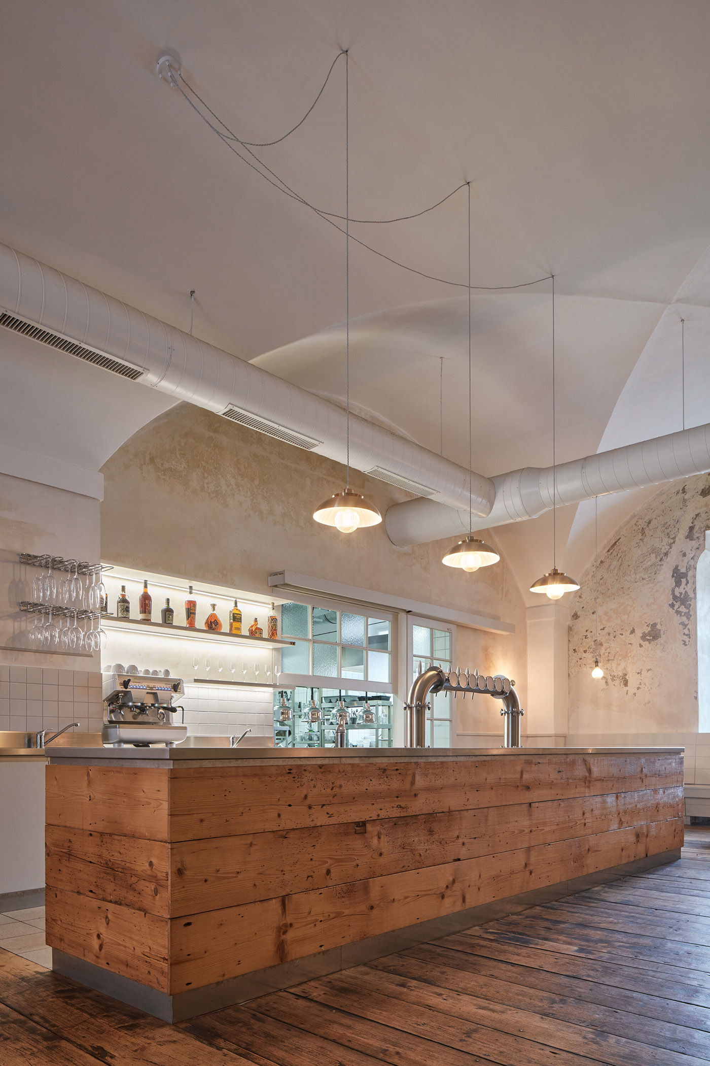 Los suelos de los pasillos cuentan con baldosas adoquinadas con un llamativo patrón de tablero de ajedrez de un fabricante checo. Los cubículos de inodoro empotrados bajos llenan los espacios arqueados, lo que permite que los arcos originales permanezcan aireados y visibles. Un elemento significativo del interior son las ventanas abatibles originales y las puertas de madera maciza. Se han restaurado objetos de valor y se han replicado otros. La iluminación y otros elementos técnicos esenciales se han diseñado para interferir mínimamente con la apariencia general del interior. Las mesas de madera de roble, los revestimientos de las paredes y los asientos gris claro neutro completan el ambiente. El uso de madera y los espacios abovedados ventilados y escasamente amueblados brindan la experiencia de degustar el menú local tradicional en un espacio distinguido