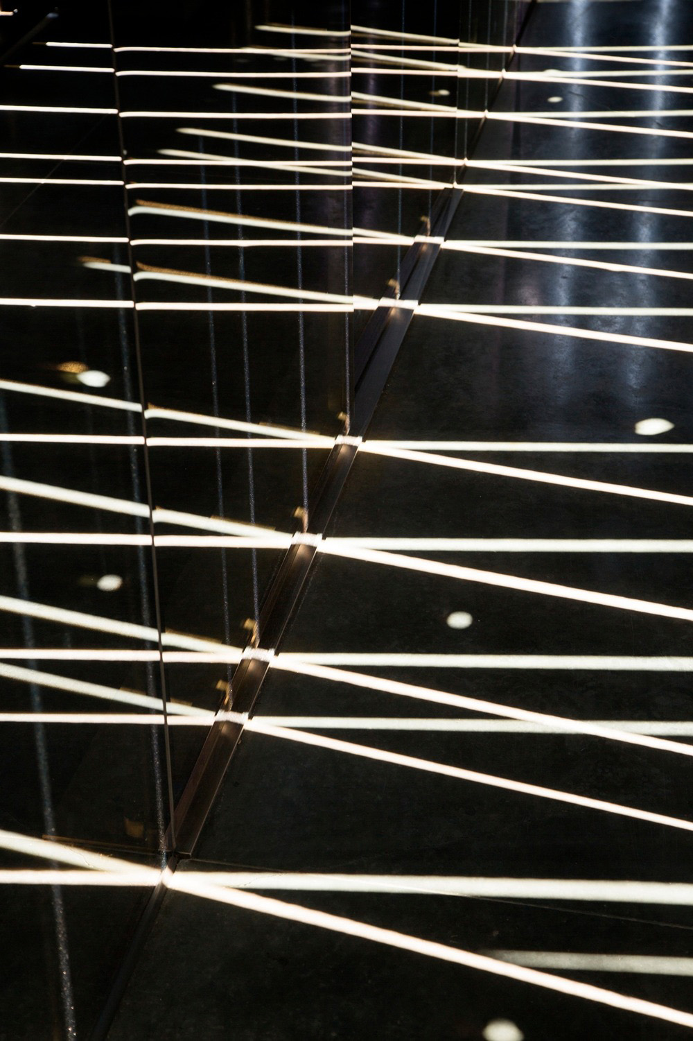 Detrás de los espejos hay un bar, una cocina para catering, un gimnasio personal y baños. Los detalles sin costuras y el uso de materiales innovadores como imanes industriales y vidrio de dos vías permiten que estos espacios funcionales desaparezcan completamente detrás de las paredes. Para maximizar el rendimiento, todos los espacios que necesitan aire acondicionado se concentran en los volúmenes de vidrio, eliminándose la necesidad de acondicionar todo el establo