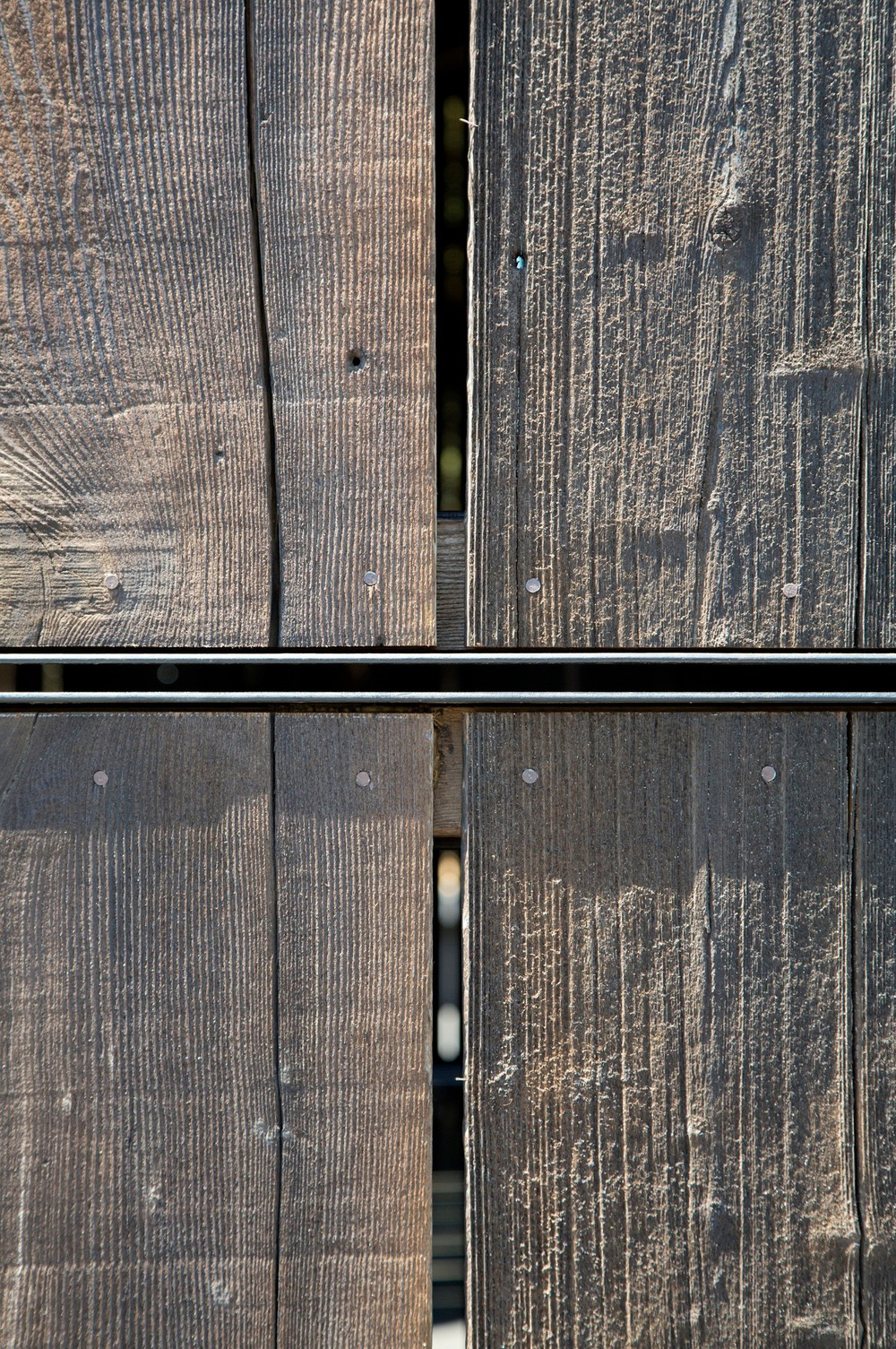 La estructura de listones de madera del granero sirve como una pantalla a través de la cual fluyen los rayos del sol, creando diseños que evolucionan constantemente en pisos de cemento de colores. En el interior, el arquitecto inserta dos nuevos volúmenes de vidrio contrapuestos cuyas paredes espejadas flanquean el espacio de recolección, reflejando el establo y el entorno circundante. Por la noche, la iluminación interior convierte el granero en una linterna
