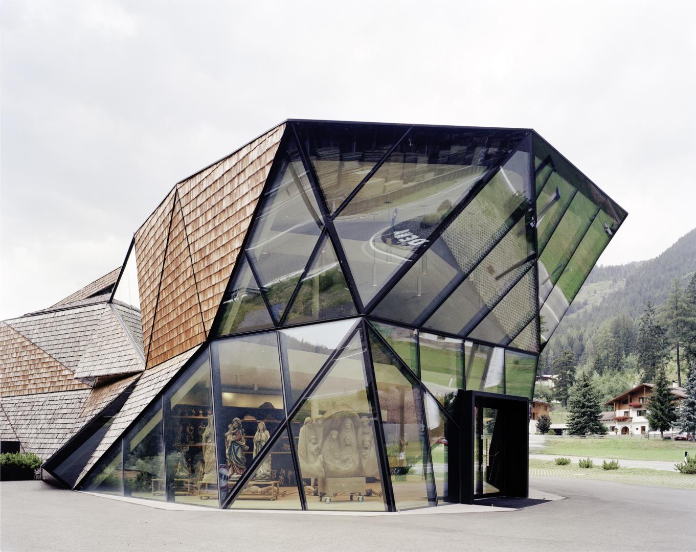 La facciata consiste in un sistema autoportante di triangolazioni. In questo sistema vengono ricavate delle aperture per favorire l`illuminazione. la facciata è rivestita di scandole in larice. Il rivestimento allude al blocco di legno grezzo non ancora rifinito