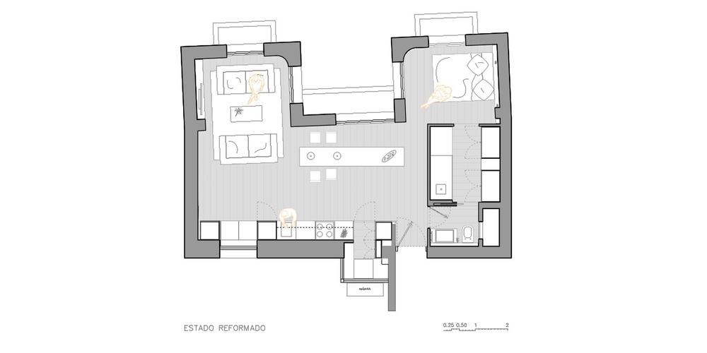 Una superficie limitata a 50 m2 deve diventare rifugio, area di lavoro, e un luogo dovUn área limitada a 50 m2 debe convertirse en un refugio, un área de trabajo y un lugar para recibir amigos sin requerir espacios diseñados exclusivamente para cada función. Un principio rector es la creación de diferentes áreas sin establecer jerarquías para priorizar su versatilidad y preservar la intimidad de ciertas áreas como el dormitorio. Los requisitos funcionales recomiendan la redefinición completa del espacioe accogliere gli amici senza che ciò richieda spazi pensati esclusivamente per ogni funzione. Un principio guida è la creazione di diverse aree senza stabilire gerarchie per dare priorità alla loro versatilità e conservare l'intimità di alcune aree come la camera da letto. I requisiti funzionali raccomandano la completa ridefinizione dello spazio