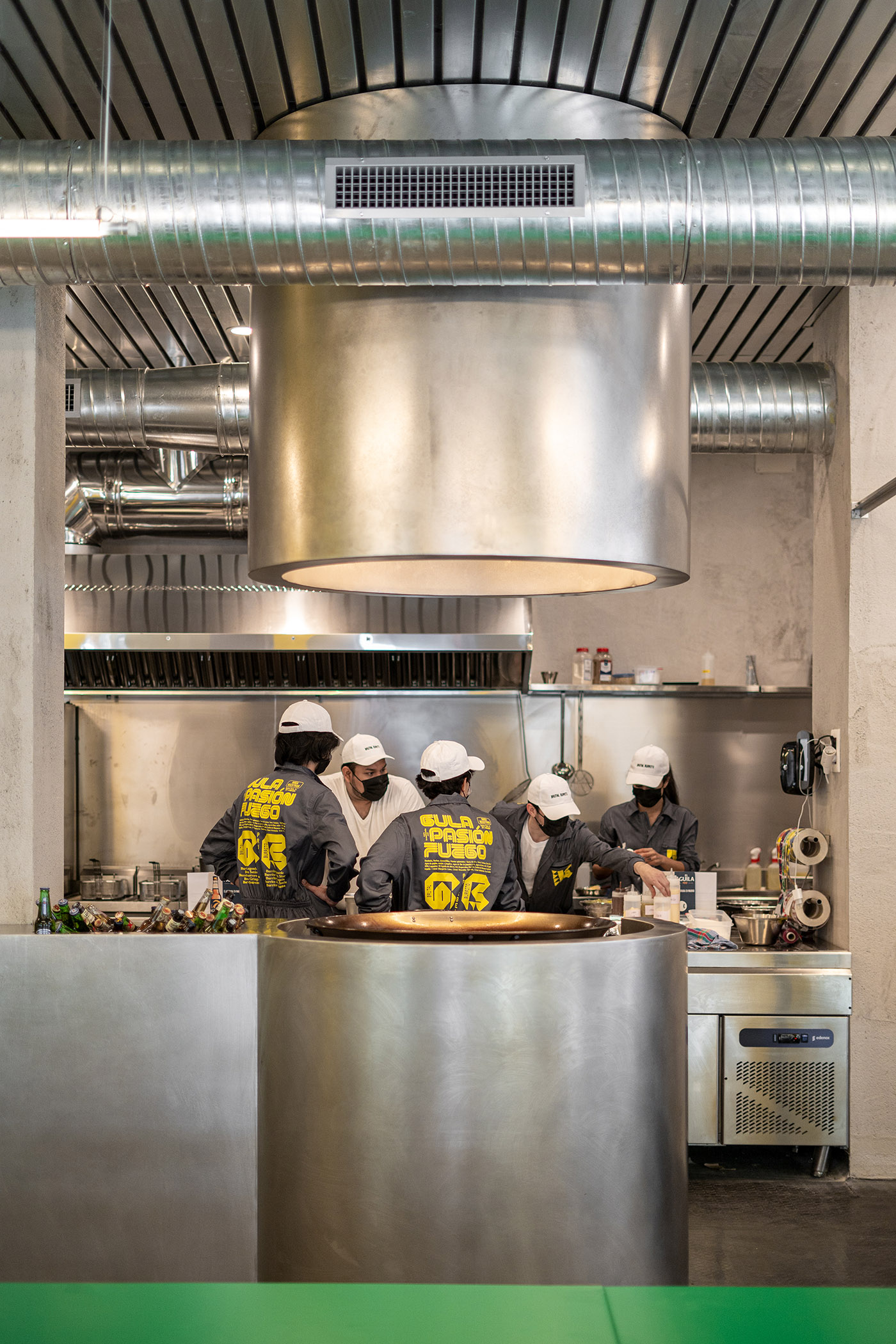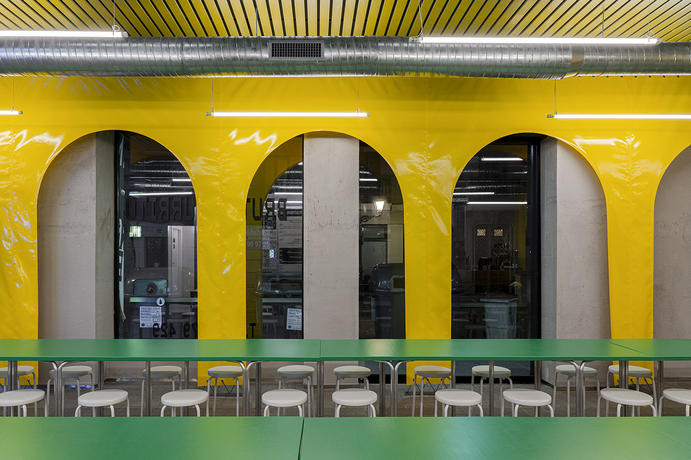 El proyecto del restaurante Brutal Burrito trata el espacio como un cuerpo a vestir, estableciendo así una distinción entre partes desnudas y vestidas. El espacio preexistente permanece sin vestir, adoptando una estética cruda basada en superficies rugosas de yeso y suelos que recuerdan la materialidad de las aceras circundantes. En su lugar, un sistema de tela distribuye las áreas de comedor. Es un patrón, el concebido por BURR Studio, que permite vestir el espacio para ocasiones especiales, vestirlo de forma más informal para una celebración, o vestirlo de manera más elegante para eventos de negocios según sea necesario. Un patrón de hecho, en lugar de un diseño cerrado