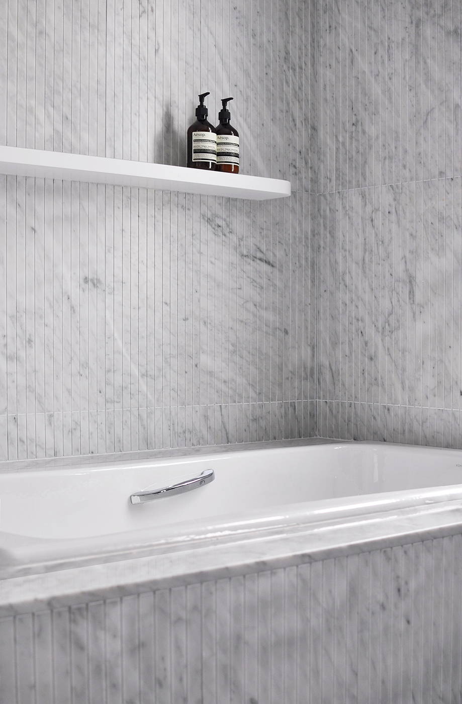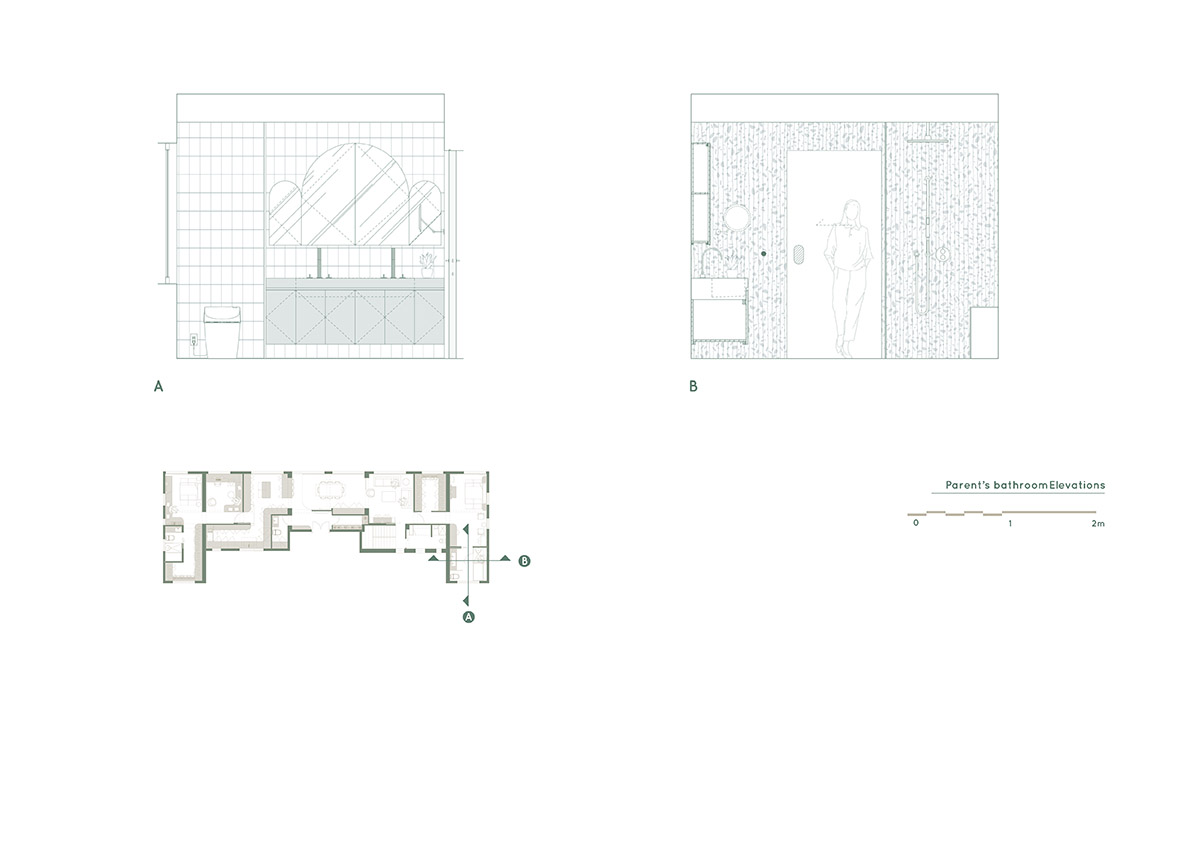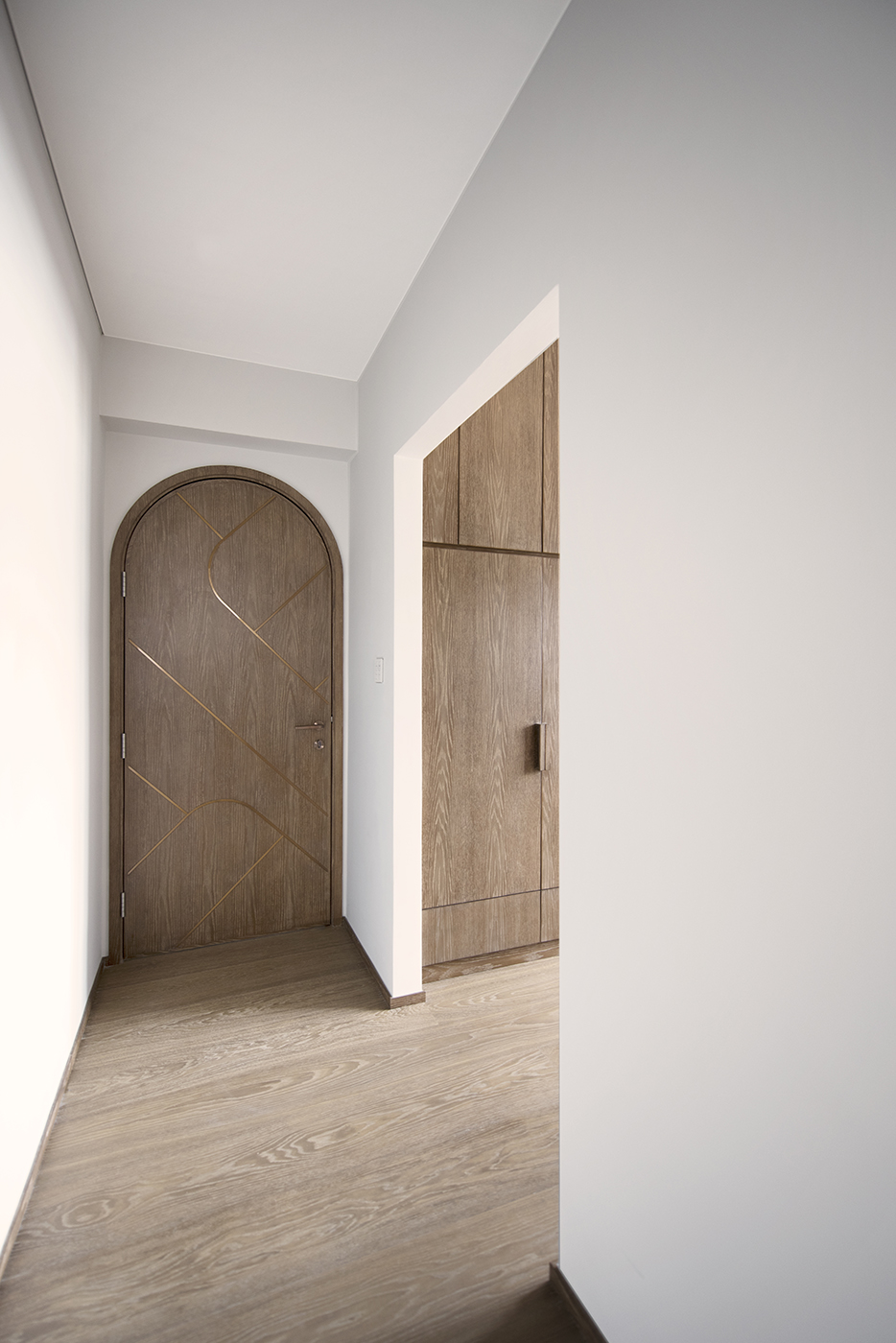El área común entre las dos áreas privadas está conceptualizada como un espacio para las "mariposas", un espacio energético para las interacciones familiares. El espacio común también cuenta con varias paredes simples y blancas, listas para la exhibición de fotografías familiares y obras de arte. A un lado encontramos la suite que consiste en un gran dormitorio con un baño vertical de mármol blanco para enfatizar la grandeza del espacio. En esta parte del apartamento, los tonos de madera son más oscuros como una interpretación contemporánea de una casa tradicional inglesa