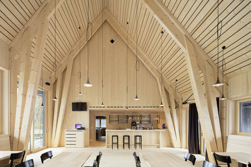 El restaurante, situado en el primer claro del bosque, recuerda a los edificios tradicionales de madera locales