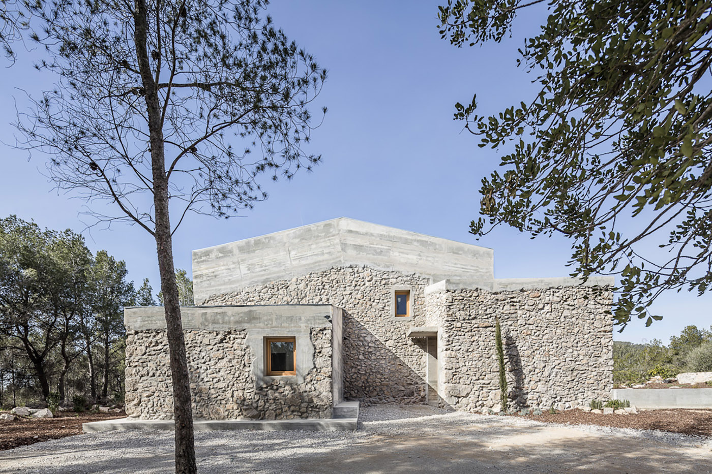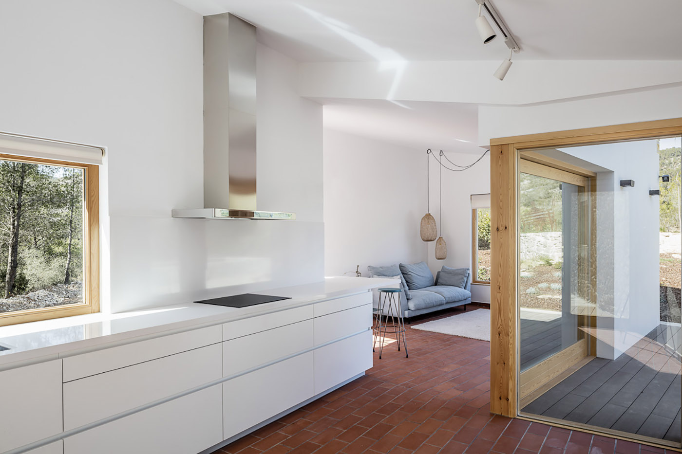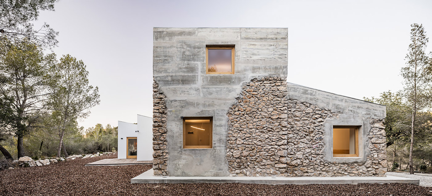 El espacio exterior circundante se ve alterado por el nuevo volumen y por una plataforma elevada sobre el suelo que actúa como mirador sobre el Parque del Garraf y que, al mismo tiempo, ayuda a distinguir el camino privado del de los visitantes del lugar.