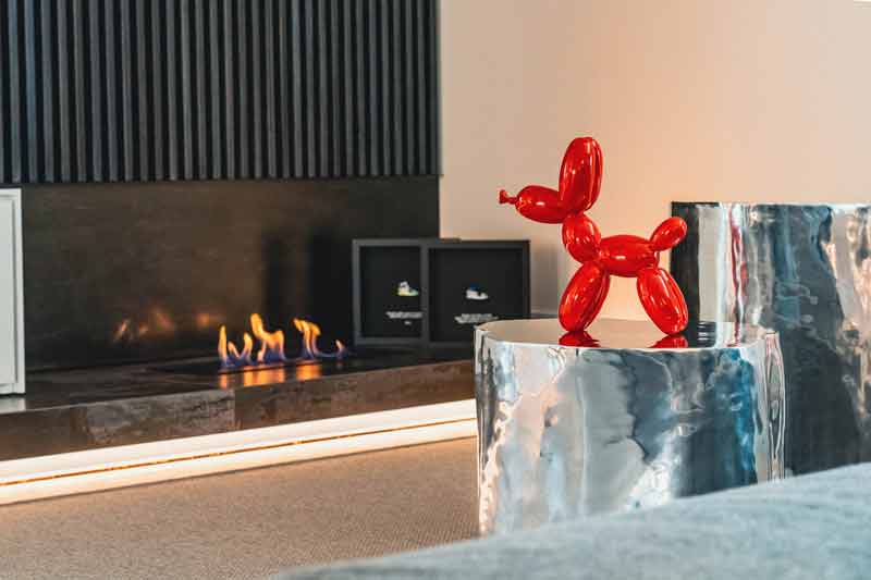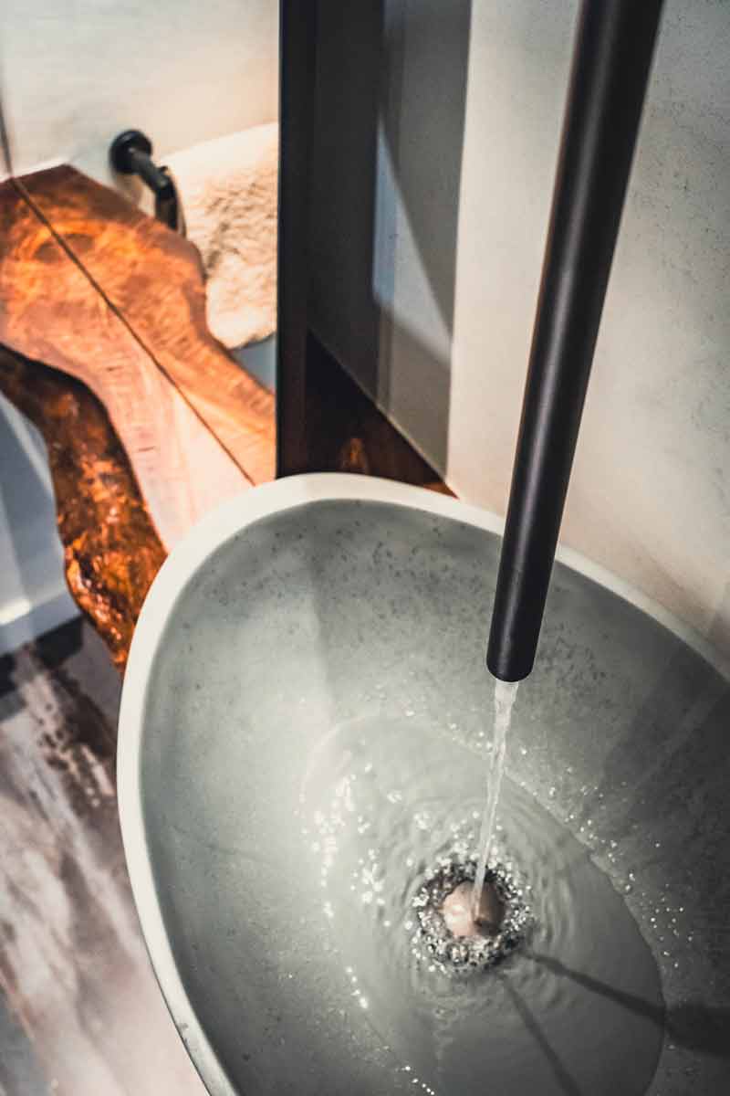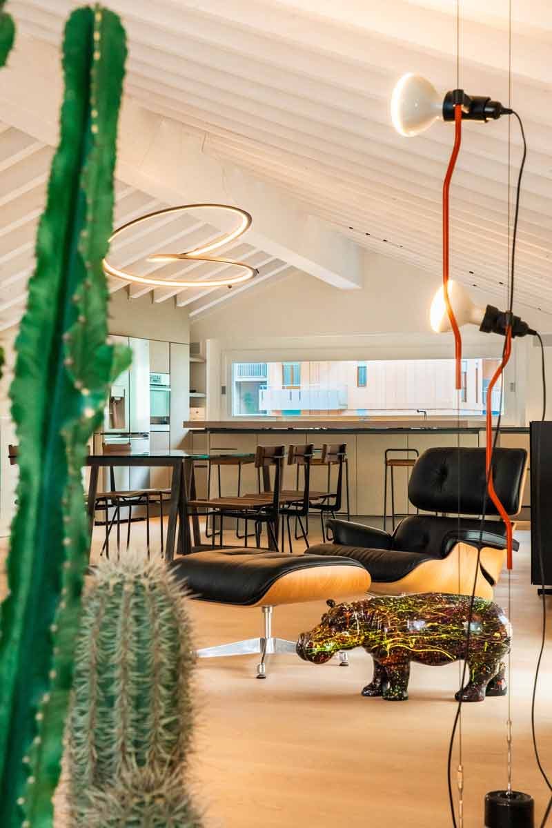 Los espacios del ático se distinguen por los muebles que, a pesar de su elegancia, mantienen una sobriedad simple y discreta. De la misma manera, la cocina se caracteriza por un diseño esencial, revestida con puertas texturizadas con acabado cementicio que le confieren un aspecto robusto y una textura áspera al tacto. Este equilibrio entre sofisticación y simplicidad impregna todo el ambiente, creando una atmósfera sofisticada pero sin ostentaciones.