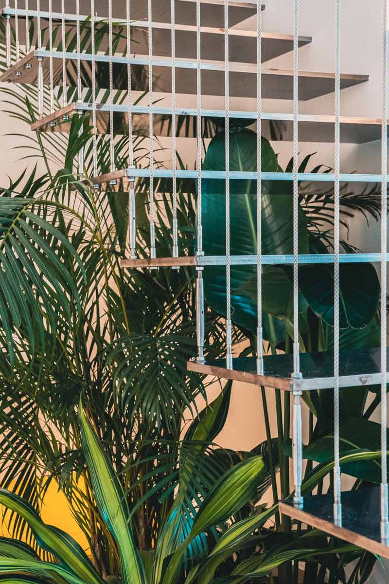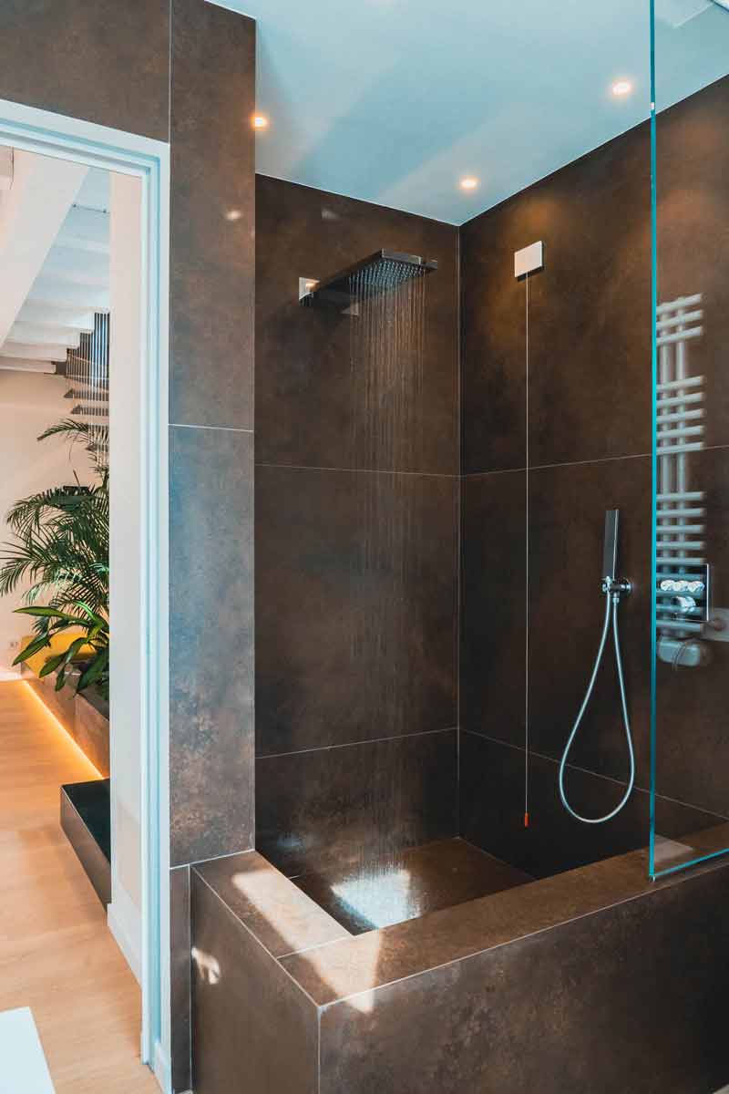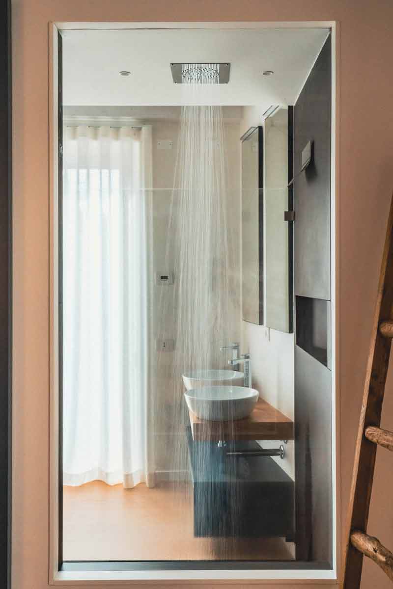 La escalera interna del ático está realizada en voladizo, en metal crudo, y está enriquecida con una iluminación escenográfica capaz de realzar los detalles. La escalera lleva a los usuarios del espacio al piso de noche, que requirió un diseño extremadamente preciso por parte del estudio, dada la fuertemente irregular distribución del espacio y las solicitudes del cliente. En particular, la pared de la cabecera de la cama principal oculta un vestidor mientras que la pared opuesta, que divide el baño dedicado, tiene una ventana en la ducha walk-in, permitiendo que la luz se filtre en un juego de luces y sombras.