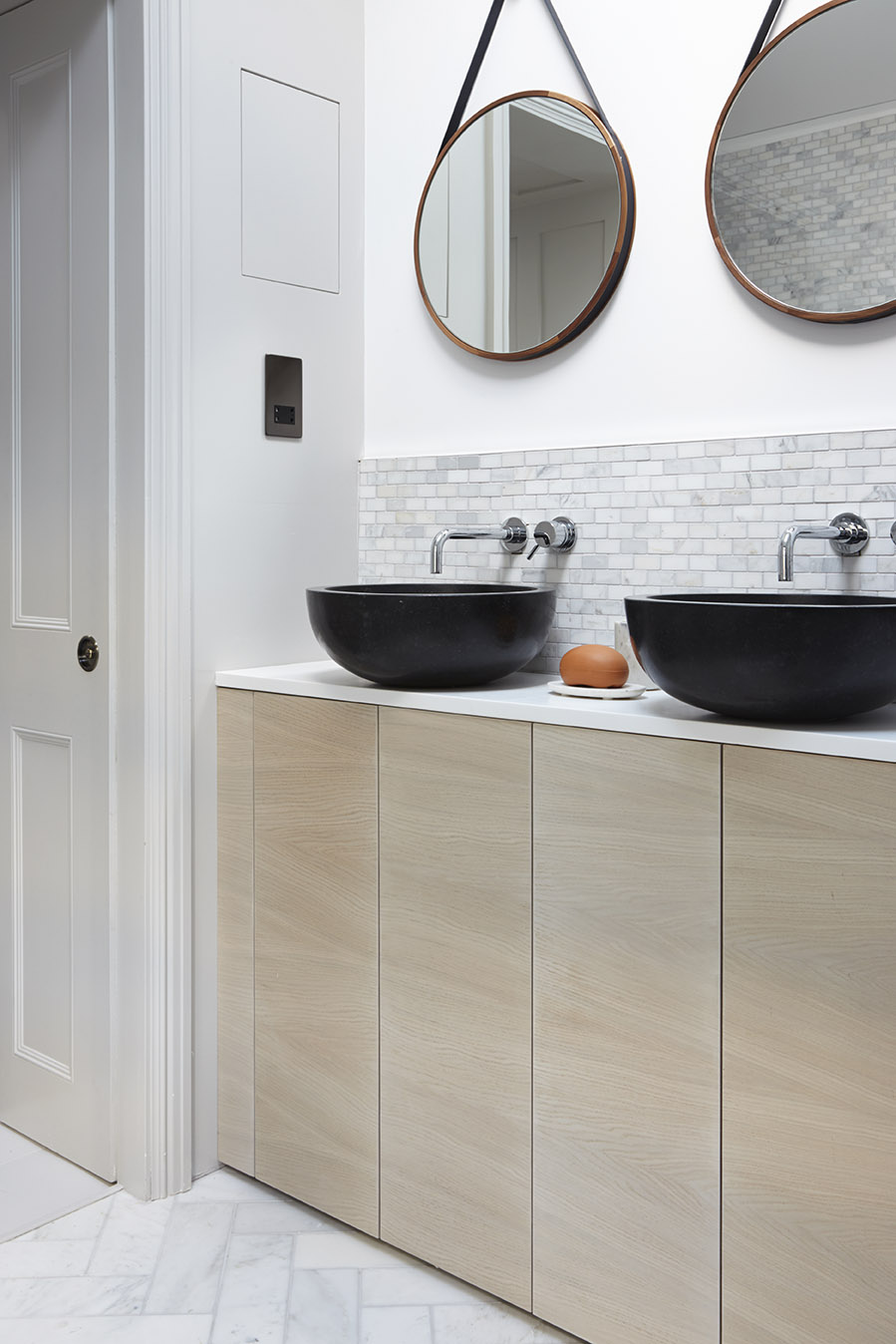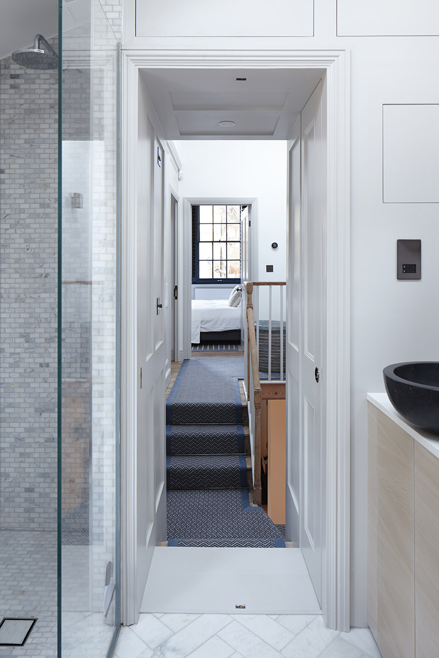 La restauración de los caminos revestidos en paneles, las boiseries para las paredes, los arquitrabes y los zócalos en su condición original celebran la historia de este edificio, mientras que la adición de una ampliación contemporánea posterior y lateral completan la vivienda