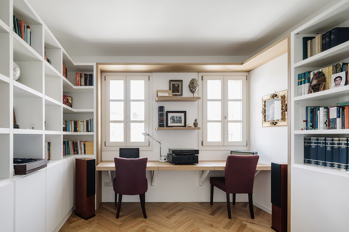 Casa AA, situada en un edificio recientemente renovado en una de las plazas principales del centro histórico de Sassari, es el resultado de la unión de tres unidades de ático en dos niveles que tenían una disposición tradicional: iluminadas sólo por tragaluces y una puerta francesa. Las intervenciones estructurales realizadas han permitido una completa renovación de los espacios de la nueva vivienda