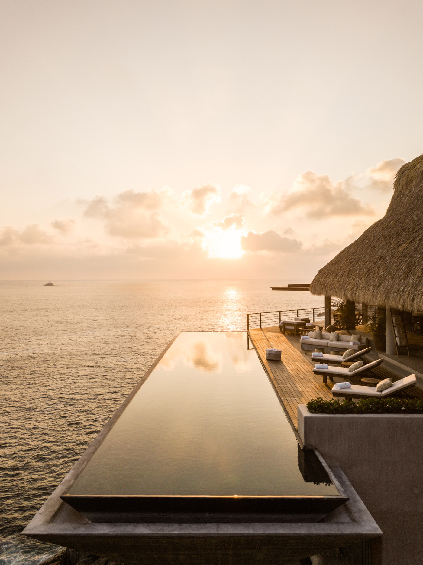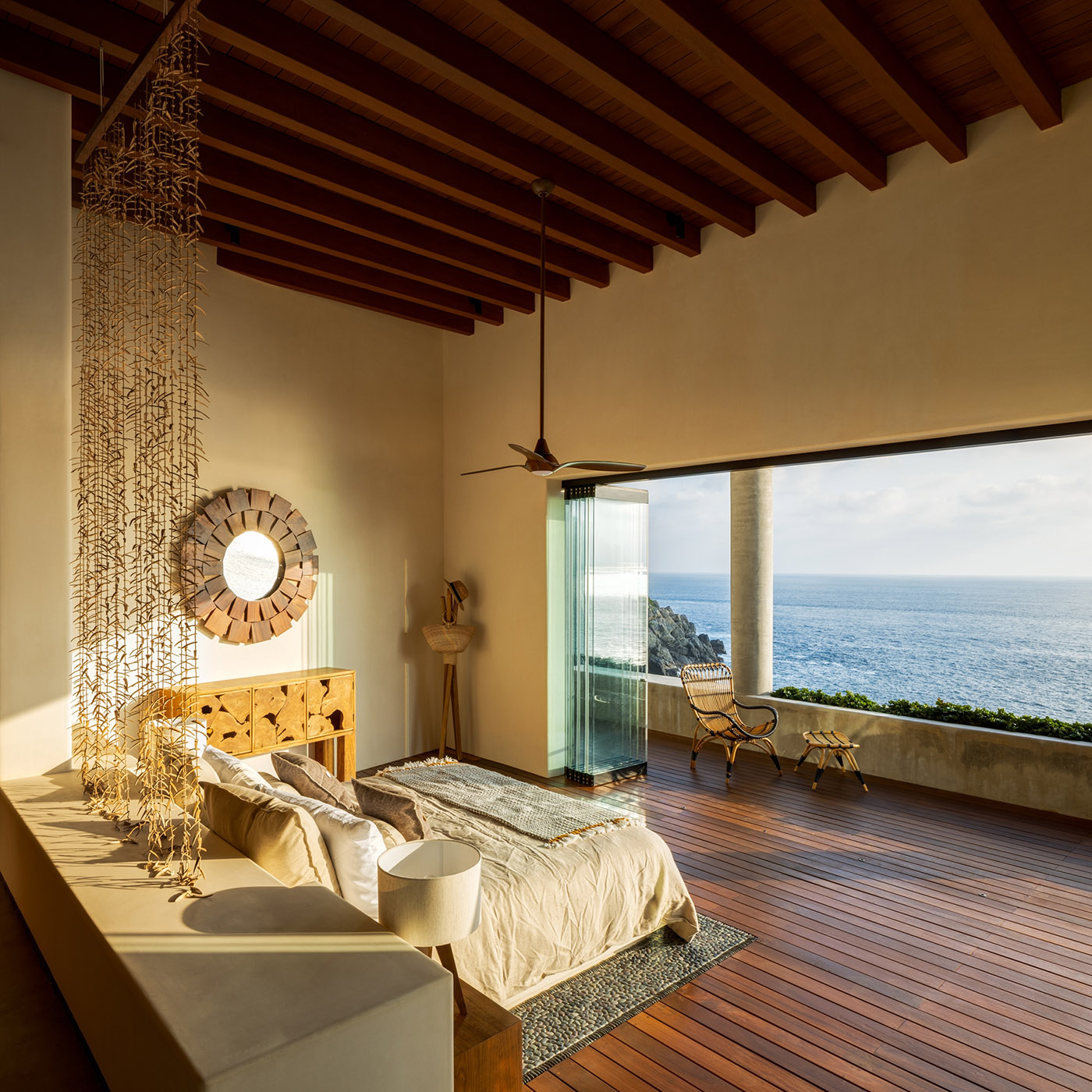 Diseñada por el estudio mexicano ZOZAYA arquitectos, Casa Acantilado presenta una arquitectura que se mezcla y entrelaza con su contexto gracias a los materiales locales y a las formas utilizadas, poniendo en práctica las técnicas artesanales y la arquitectura autóctona de la zona. El espacio de la villa está compuesto por dos elementos geométricos ligeramente girados para orientar las vistas hacia el Pacífico: en este proyecto, la topografía es un factor determinante en la organización espacial