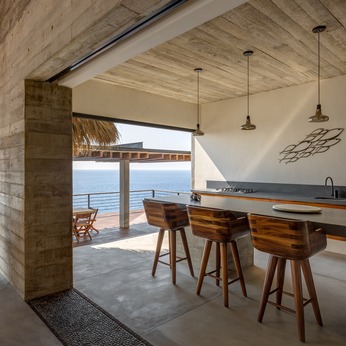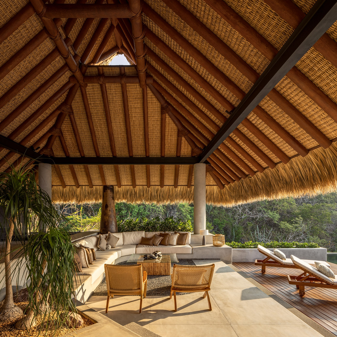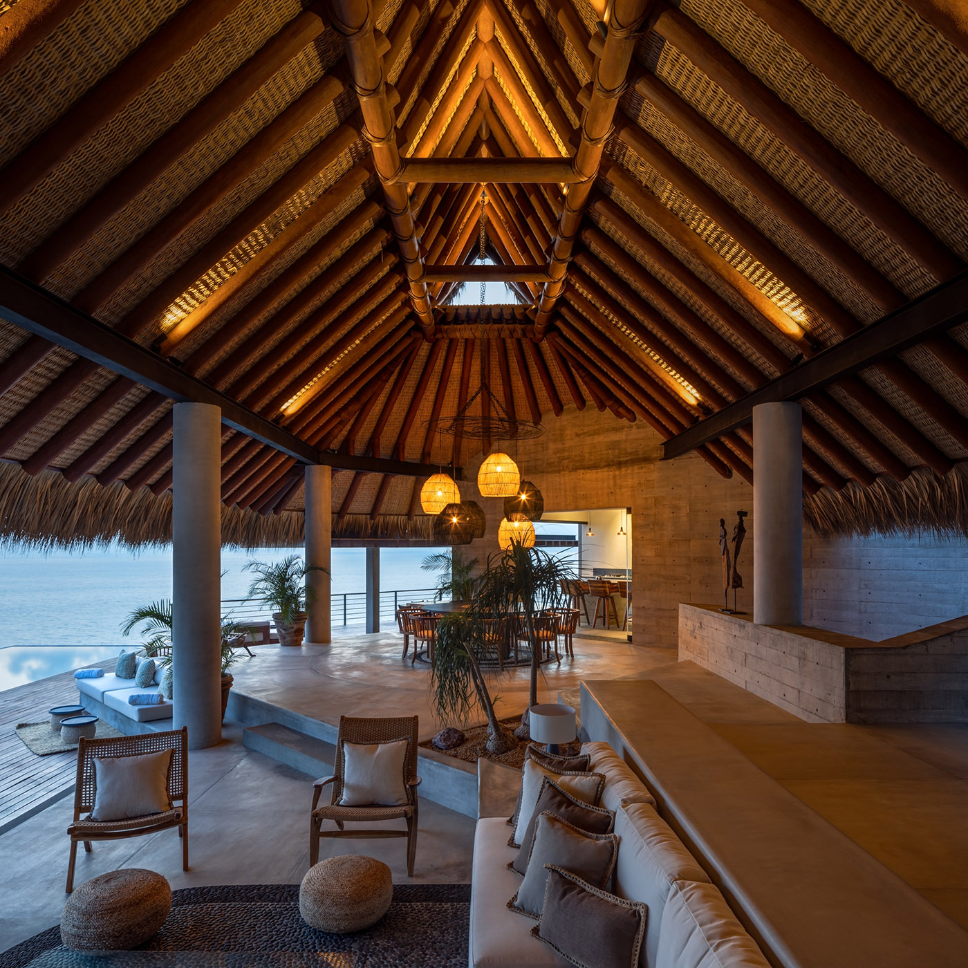 Entrando directamente desde el nivel superior, donde no hay puerta de entrada, una gran Palapa, un pórtico cubierto, da la bienvenida al visitante que descubre aquí el área social completamente abierta y expuesta al majestuoso paisaje. La Palapa está hecha de materiales autóctonos como piedra, madera y hojas de palma; es una estructura tradicional de la zona y está construida por mano de obra local, su forma permite la entrada de luz y la ventilación cruzada natural reduciendo el consumo energético de la residencia