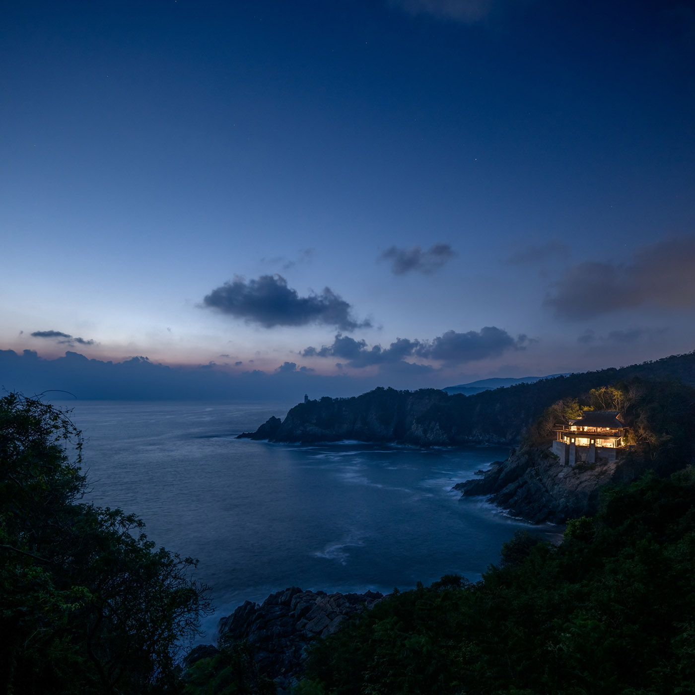 En la costa del Pacífico de Guerrero, en la bahía de Zihuatanejo, enclavada sobre los acantilados siempre a merced del mar, se encuentra la Casa Acantilado. Abierta e inmersa en su espectacular entorno, la estructura conceptualiza la idea de un punto de referencia luminoso en la inmensa oscuridad nocturna del océano, emergiendo de las rocas y dialogando con el pequeño faro que se encuentra a poca distancia