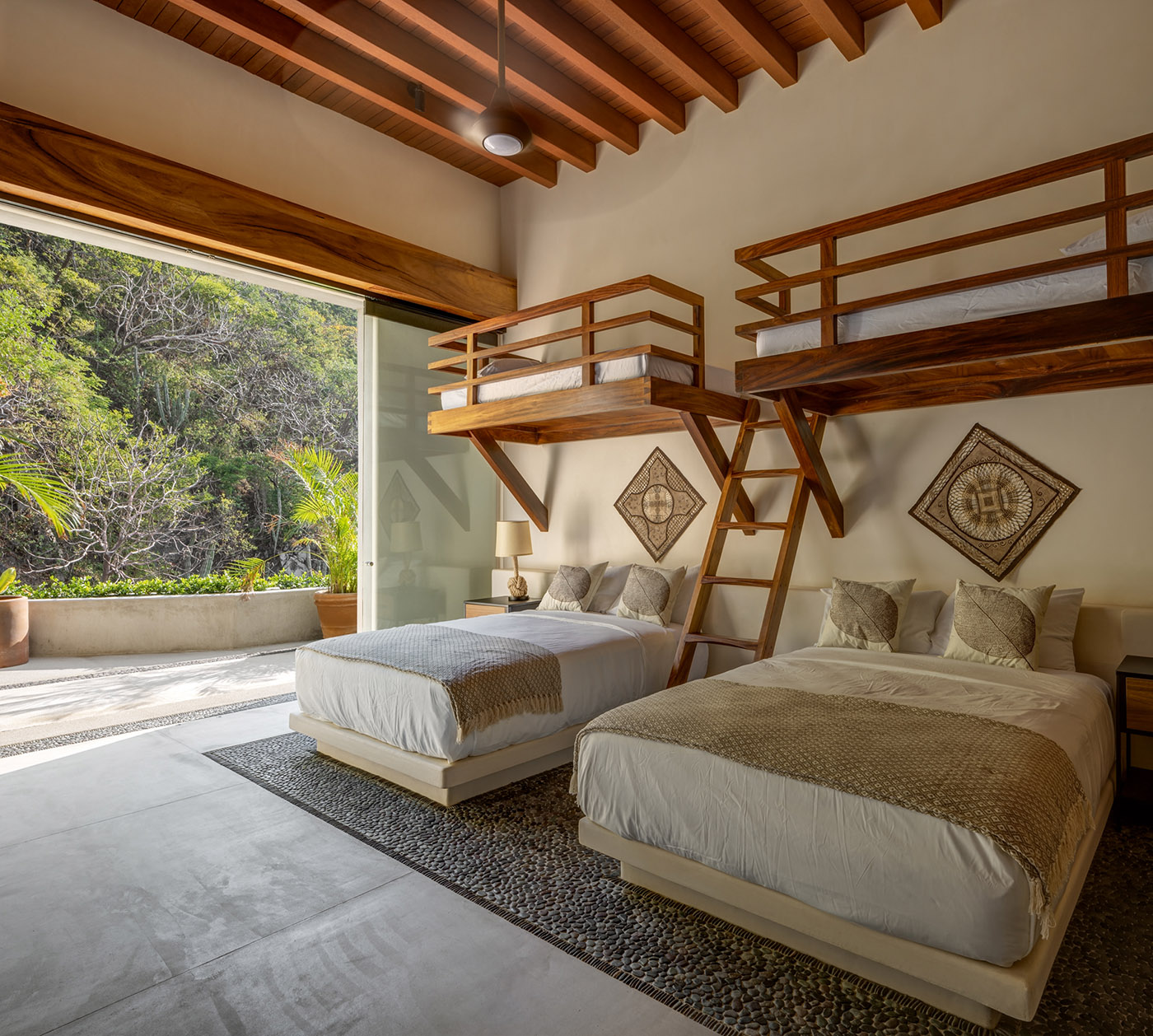 La escalera que conduce a la zona privada se extiende a lo largo de las paredes de hormigón expuesto sin cubierta que permiten ver el movimiento de las copas de los árboles; en esta casa es posible disfrutar del exterior estando siempre protegido. La zona de distribución termina en el vestíbulo de la planta inferior, donde una piscina se encuentra entre las paredes de hormigón que enmarcan una continuidad infinita con el Pacífico. El vestíbulo conecta con las habitaciones, cada una con terrazas privadas que se abren a espacios de contemplación hacia el increíble paisaje