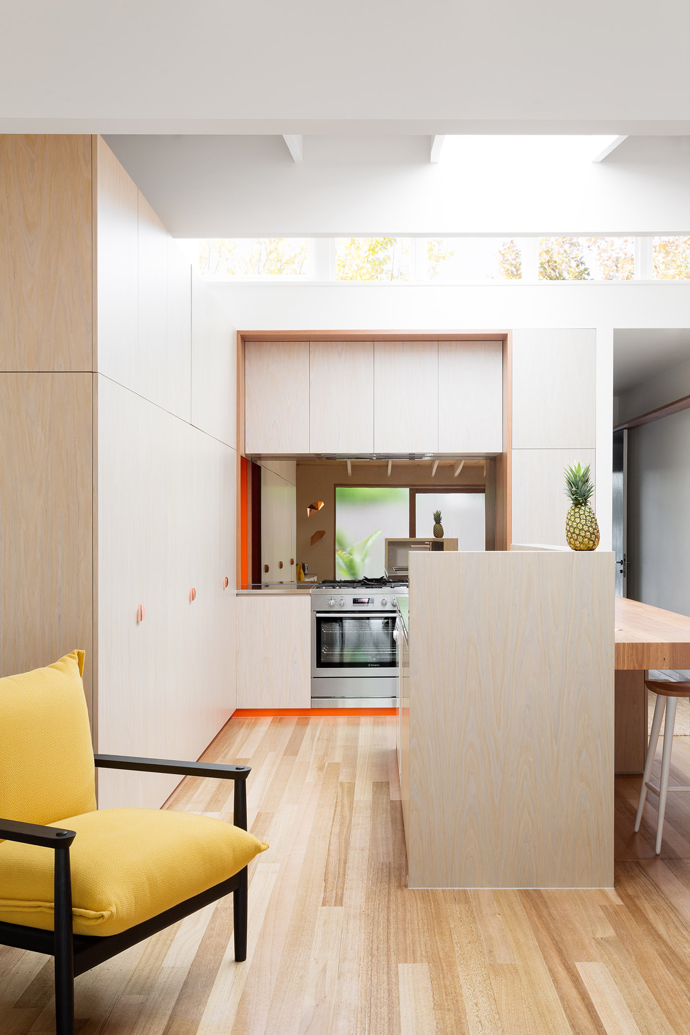 El pasillo también está completamente revestido de espejos que crean una divertida sensación de desorientación; por encima de los espejos, una pasarela de madera en miniatura permite a los gatos experimentar la casa a su manera y a los habitantes humanos percibir su residencia como un espacio de juego
