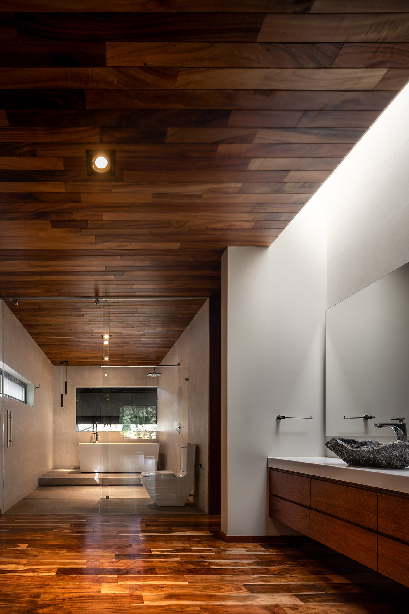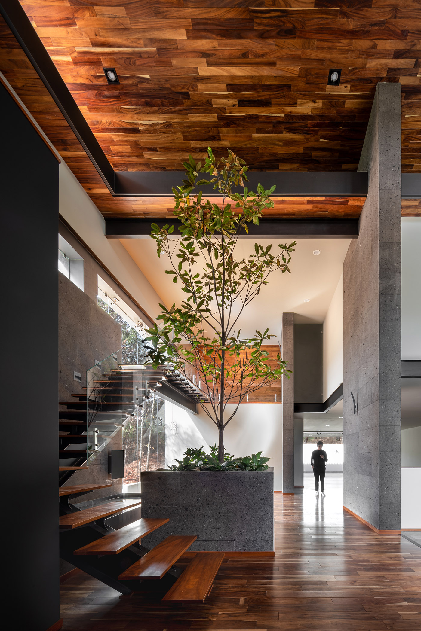 En la paleta de materiales se pueden apreciar 3 elementos base, las maderas para dar calidez, la piedra de cantera típica de la región con un carácter sobrio de perpetuidad y el acero desnudo de carácter moderno. En la Casa entre Pinos encontramos ese equilibrio de arquitectura que habla de su contemporaneidad y se adapta tanto al contexto natural como al arquitectónico