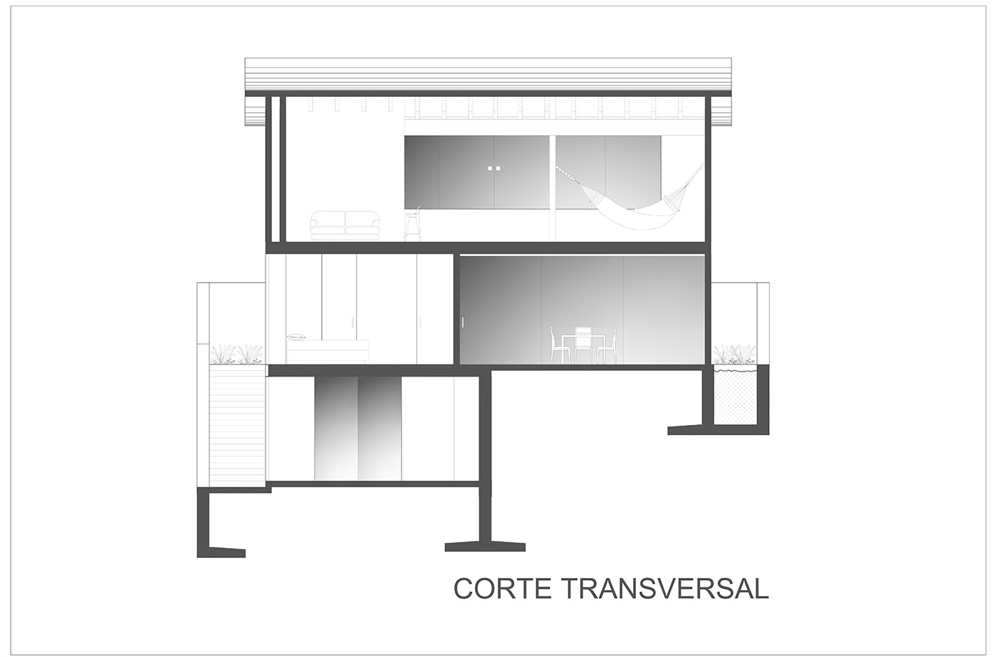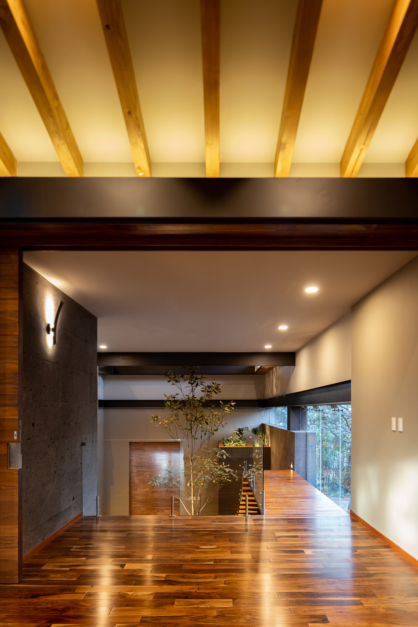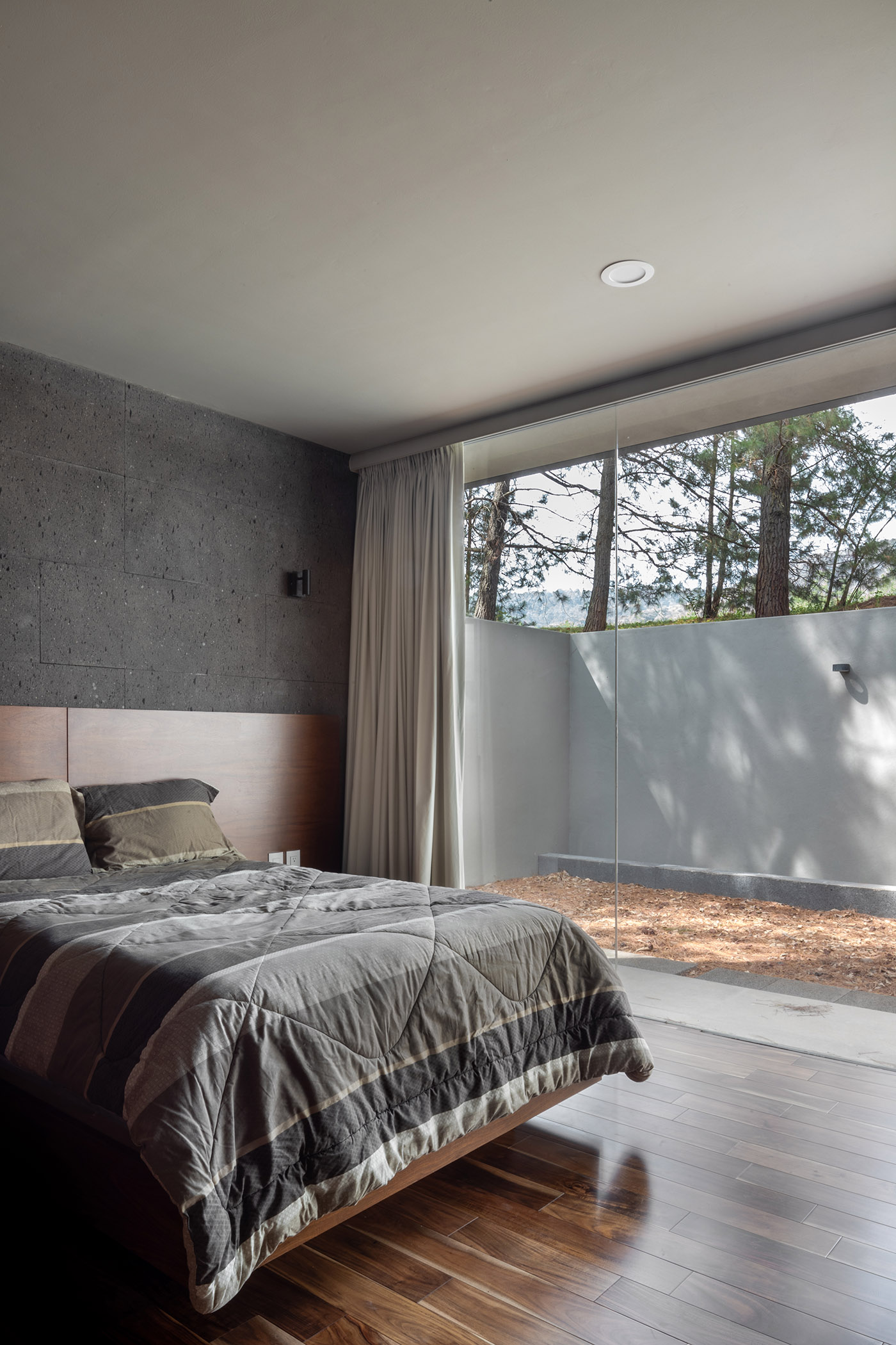 El loft superior tiene la capacidad de "hermetizarse" o convertirse uno con el nivel inferior por medio de un balcón que abraza el contexto natural, fusionándose como un "todo"; el último piso de Casa entre Pinos también es capaz de conectarse con el jardín a través de una mampara translúcida que corre transversalmente, creando un espacio continuo en contacto con el exterior