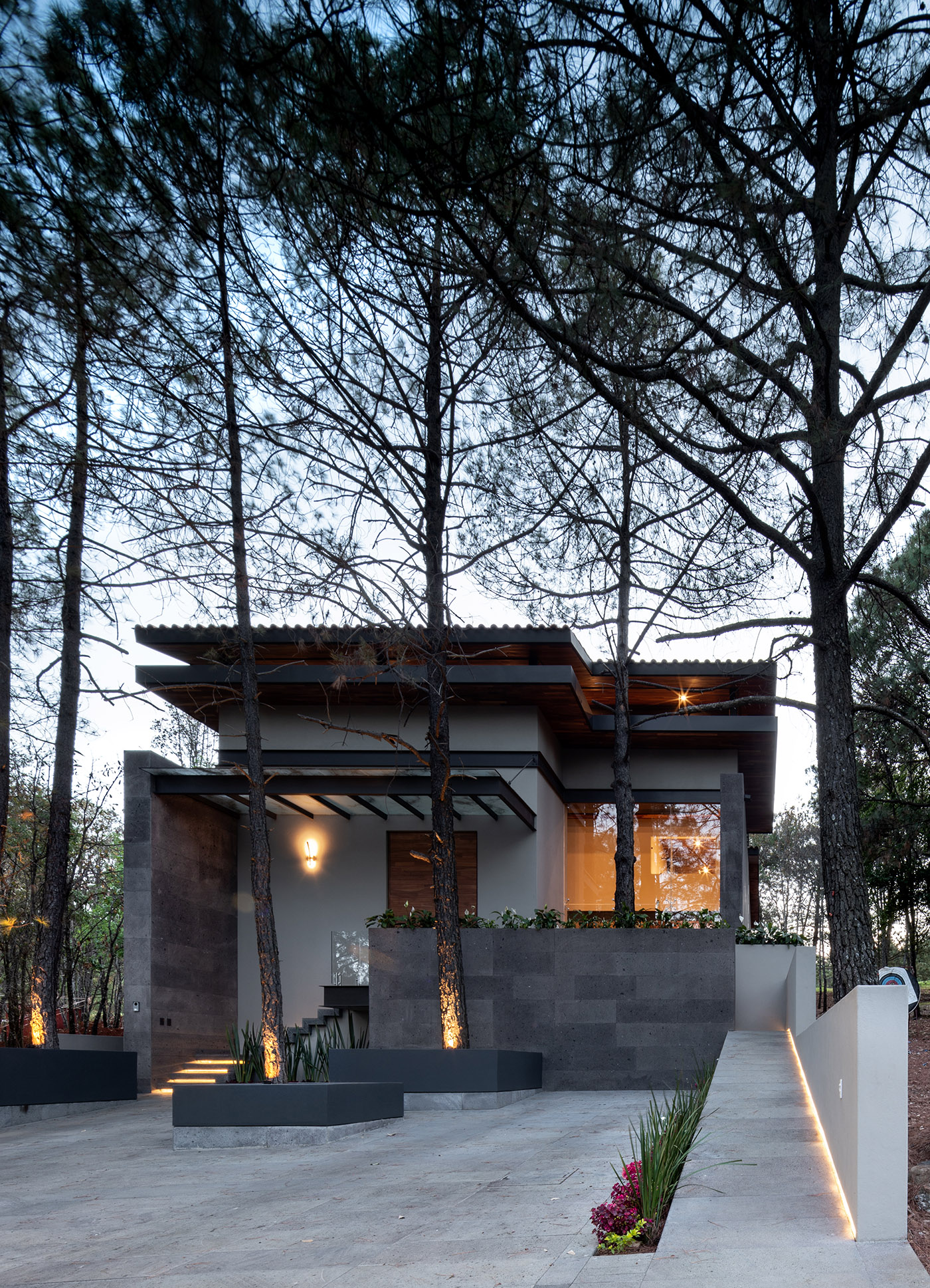 Casa entre Pinos toma su nombre de los 5 pinos que protegen pacíficamente el entorno sobre el que se ubica la vivienda y suavizan el horizonte. Estamos en terrenos en pendiente adyacentes al campo de golf del complejo residencial Altozano, en Morelia, México
