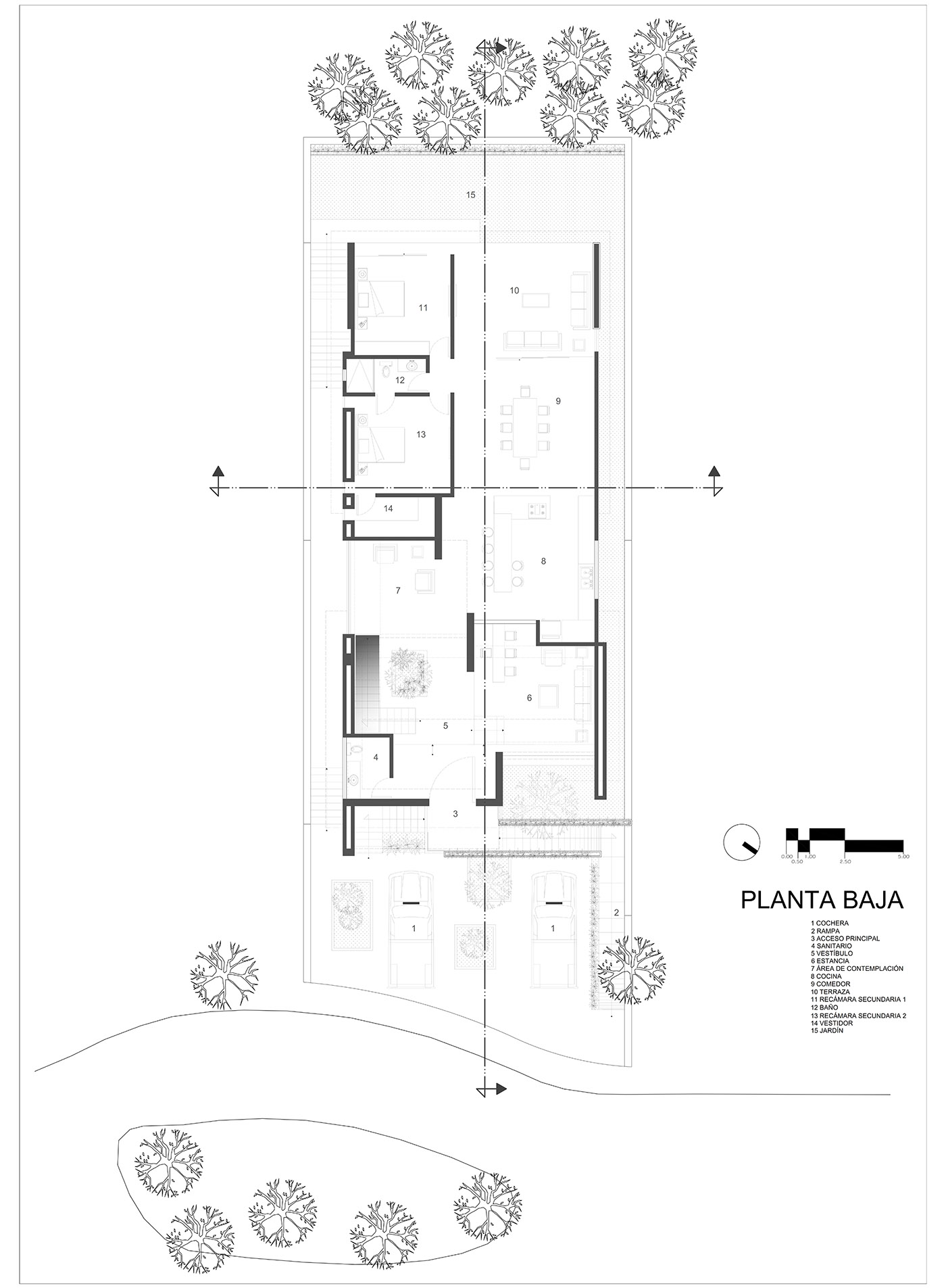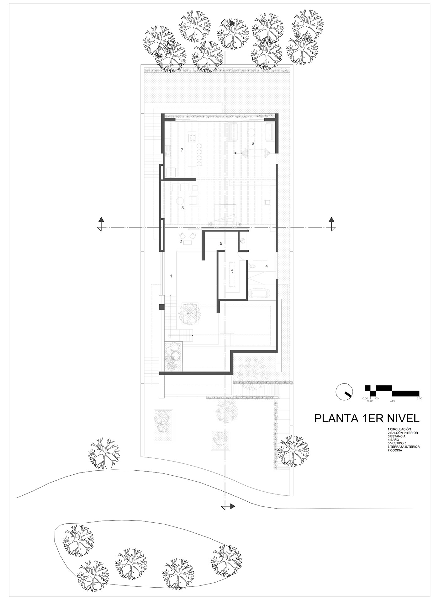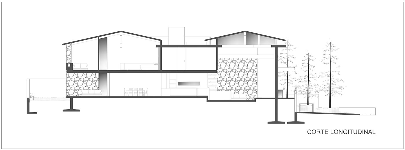 Casa entre Pinos es un volumen donde 3 niveles, dos residenciales y uno dedicado a servicios, se entrelazan creativamente, pero dejando espacio a la naturaleza como protagonista.